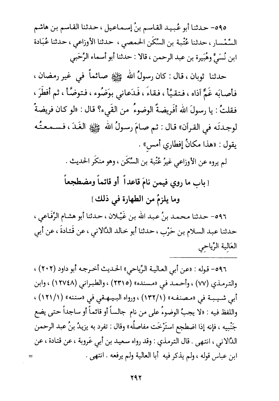 595 - حَدَّثَنَا أَبُو عُبَيْدٍ الْقَاسِمُ بْنُ إِسْمَاعِيلَ , نا الْقَاسِمُ بْنُ هَاشِمٍ السِّمْسَارُ , نا عُتْبَةُ بْنُ السَّكَنِ الْحِمْصِيُّ , نا الْأَوْزَاعِيُّ , نا عُبَادَةُ بْنُ نُسِيٍّ , وَهُبَيْرَةُ بْنُ عَبْدِ الرَّحْمَنِ , قَالَا: نا أَبُو أَسْمَاءَ الرَّحَبِيُّ , نا ثَوْبَانُ , قَالَ: كَانَ رَسُولُ اللَّهِ صَلَّى اللهُ عَلَيْهِ وَسَلَّمَ صَائِمًا مِنْ غَيْرِ رَمَضَانَ فَأَصَابَهُ غَمٌّ أَذَاهُ فَتَقَيَّأَ , فَقَاءَ فَدَعَانِي بِوَضُوءٍ فَتَوَضَّأَ ثُمَّ أَفْطَرَ , فَقُلْتُ: يَا رَسُولَ اللَّهِ أَفَرِيضَةٌ الْوُضُوءُ مِنَ الْقَيْءِ؟ , قَالَ: «§لَوْ كَانَ فَرِيضَةً لَوَجَدْتُهُ فِي الْقُرْآنِ» , قَالَ: ثُمَّ صَامَ رَسُولُ اللَّهِ صَلَّى اللهُ عَلَيْهِ وَسَلَّمَ الْغَدَ فَسَمِعْتُهُ يَقُولُ: «هَذَا مَكَانُ إِفْطَارِي أَمْسَ». لَمْ يَرْوِهِ عَنِ الْأَوْزَاعِيِّ غَيْرُ عُتْبَةَ بْنِ السَّكَنِ وَهُوَ مُنْكَرُ الْحَدِيثِ