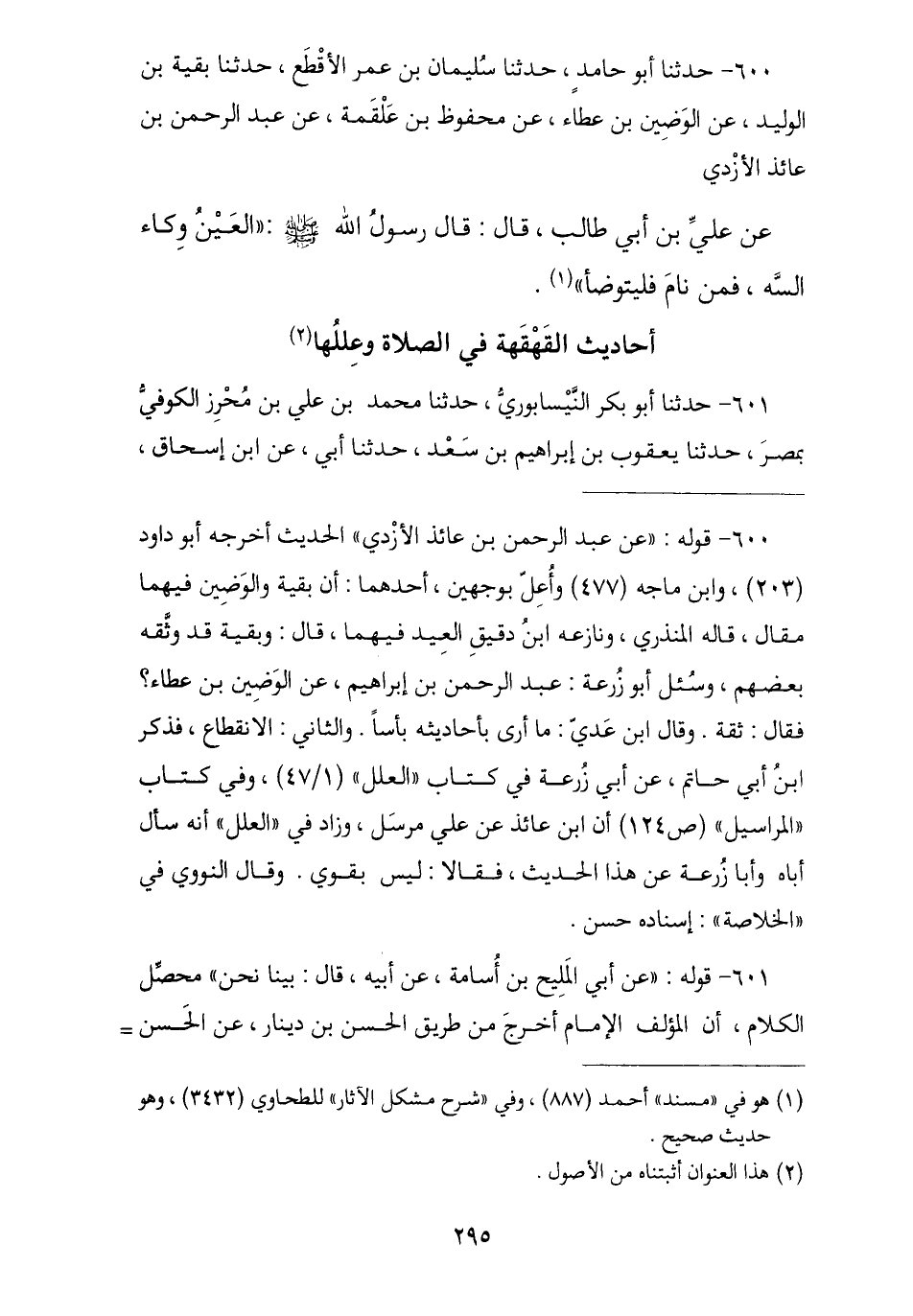 600 - حَدَّثَنَا أَبُو حَامِدٍ , نا سُلَيْمَانُ بْنُ عُمَرَ الْأَقْطَعُ , نا بَقِيَّةُ بْنُ الْوَلِيدِ , عَنِ الْوَضِينِ بْنِ عَطَاءٍ , عَنْ مَحْفُوظِ بْنِ عَلْقَمَةَ , عَنْ عَبْدِ الرَّحْمَنِ بْنِ عَائِذٍ الْأَزْدِيِّ , عَنْ عَلِيٍّ بْنِ أَبِي طَالِبٍ رَضِيَ اللَّهُ عَنْهُ , قَالَ: قَالَ رَسُولُ اللَّهِ صَلَّى اللهُ عَلَيْهِ وَسَلَّمَ: § «الْعَيْنُ وِكَاءُ السَّهِ فَمَنْ نَامَ فَلْيَتَوَضَّأْ»