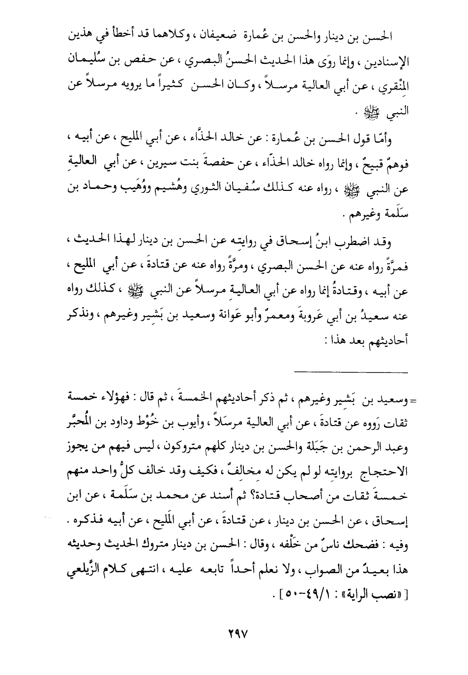 الْحَسَنُ بْنُ دِينَارٍ وَالْحَسَنُ بْنُ عُمَارَةَ ضَعِيفَانِ , وَكِلَاهُمَا قَدْ أَخْطَأَ فِي هَذَيْنِ الْإِسْنَادَيْنِ وَإِنَّمَا رَوَى هَذَا الْحَدِيثَ الْحَسَنُ الْبَصْرِيُّ , عَنْ حَفْصِ بْنِ سُلَيْمَانَ الْمِنْقَرِيِّ عَنْ أَبِي الْعَالِيَةِ مُرْسَلًا , وَكَانَ الْحَسَنُ كَثِيرًا مَا يَرْوِيهِ مُرْسَلًا عَنِ النَّبِيِّ صَلَّى اللهُ عَلَيْهِ وَسَلَّمَ , وَأَمَّا قَوْلُ الْحَسَنِ بْنِ عُمَارَةَ , عَنْ خَالِدٍ الْحَذَّاءِ , عَنْ أَبِي الْمَلِيحِ , عَنْ أَبِيهِ , فَوَهْمٌ قَبِيحٌ , وَإِنَّمَا رَوَاهُ خَالِدٌ الْحَذَّاءُ , عَنْ حَفْصَةَ بِنْتِ سِيرِينَ , عَنْ أَبِي الْعَالِيَةَ , عَنِ النَّبِيِّ صَلَّى اللهُ عَلَيْهِ وَسَلَّمَ , رَوَاهُ عَنْهُ كَذَلِكَ سُفْيَانُ الثَّوْرِيُّ , وَهُشَيْمٌ , وَوُهَيْبٌ , وَحَمَّادُ بْنُ سَلَمَةَ وَغَيْرُهُمْ وَقَدِ اضْطَرَبَ ابْنُ إِسْحَاقَ فِي رِوَايَتِهِ , عَنِ الْحَسَنِ بْنِ دِينَارٍ لِهَذَا الْحَدِيثِ فَمَرَّةً رَوَاهُ عَنْهُ عَنِ الْحَسَنِ الْبَصْرِيِّ , وَمَرَّةً رَوَاهُ عَنْهُ عَنْ قَتَادَةَ , عَنْ أَبِي الْمَلِيحِ , عَنْ أَبِيهِ , وَقَتَادَةُ إِنَّمَا رَوَاهُ عَنْ أَبِي الْعَالِيَةِ مُرْسَلًا , عَنِ النَّبِيِّ صَلَّى اللهُ عَلَيْهِ وَسَلَّمَ , كَذَلِكَ رَوَاهُ عَنْهُ سَعِيدُ بْنُ أَبِي عَرُوبَةَ وَمَعْمَرٌ , وَأَبُو عَوَانَةَ , وَسَعِيدُ بْنُ بَشِيرٍ وَغَيْرُهُمْ وَيَذْكُرُ أَحَادِيثَهُمْ بِذَلِكَ بَعْدَ هَذَا
