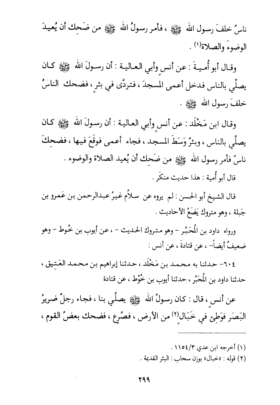 604 - حَدَّثَنَا بِهِ مُحَمَّدُ بْنُ مَخْلَدٍ , نا إِبْرَاهِيمُ بْنُ مُحَمَّدٍ الْعَتِيقُ , حَدَّثَنَا دَاوُدُ بْنُ الْمُحَبَّرِ , نا أَيُّوبُ بْنُ خُوطٍ , عَنْ قَتَادَةَ , عَنْ أَنَسٍ , قَالَ: كَانَ رَسُولُ اللَّهِ صَلَّى اللهُ عَلَيْهِ وَسَلَّمَ يُصَلِّي بِنَا , فَجَاءَ رَجُلٌ ضَرِيرُ الْبَصَرِ فَوَطِئَ فِي خَبَالٍ مِنَ الْأَرْضِ , فَصُرِعَ فَضَحِكَ بَعْضُ الْقَوْمِ , -[300]- فَأَمَرَ رَسُولُ اللَّهِ صَلَّى اللهُ عَلَيْهِ وَسَلَّمَ «مَنْ ضَحِكَ أَنْ §يُعِيدَ الْوُضُوءَ وَالصَّلَاةَ». وَالصَّوَابُ مِنْ ذَلِكَ قَوْلُ مَنْ رَوَاهُ عَنْ قَتَادَةَ , عَنْ أَبِي الْعَالِيَةِ , مُرْسَلًا