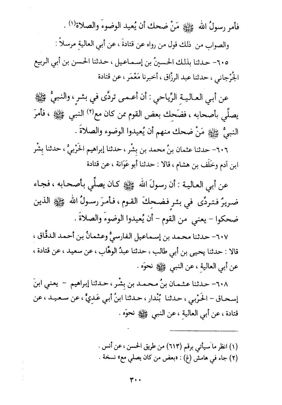 606 - حَدَّثَنَا عُثْمَانُ بْنُ مُحَمَّدِ بْنِ بِشْرٍ , نا إِبْرَاهِيمُ بْنُ إِسْحَاقَ الْحَرْبِيُّ , نا بِشْرُ بْنُ آدَمَ , وَخَلَفُ بْنُ هِشَامٍ , قَالَا: نا أَبُو عَوَانَةَ , عَنْ قَتَادَةَ , عَنْ أَبِي الْعَالِيَةِ , أَنَّ رَسُولَ اللَّهِ صَلَّى اللهُ عَلَيْهِ وَسَلَّمَ كَانَ يُصَلِّي بِأَصْحَابِهِ , فَجَاءَ ضَرِيرٌ فَتَرَدَّى فِي بِئْرٍ فَضَحِكَ الْقَوْمُ , فَأَمَرَ رَسُولُ اللَّهِ صَلَّى اللهُ عَلَيْهِ وَسَلَّمَ الَّذِينَ ضَحِكُوا «أَنْ §يُعِيدُوا الْوُضُوءَ وَالصَّلَاةَ».