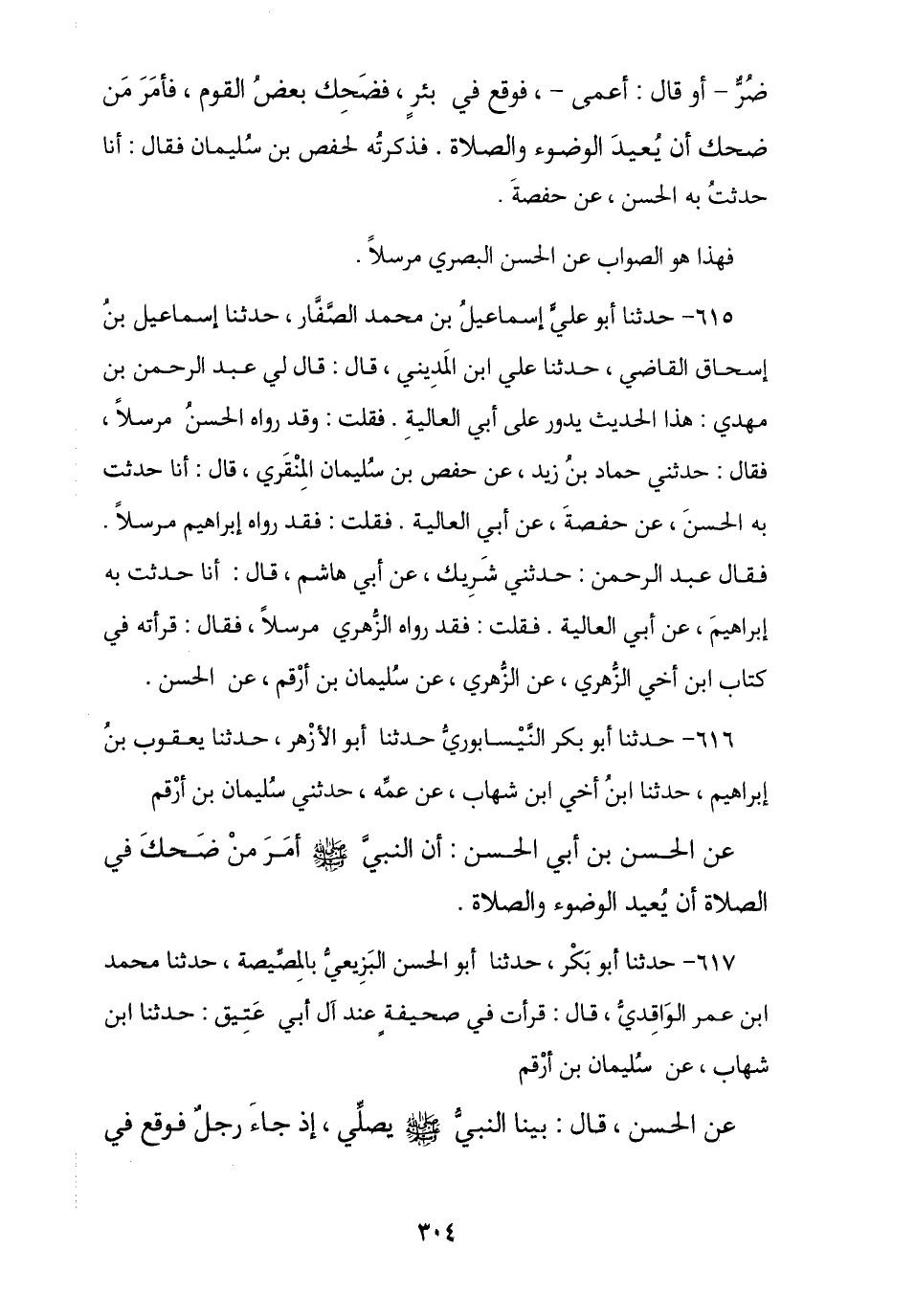 617 - حَدَّثَنَا أَبُو بَكْرٍ , نا أَبُو الْحَسَنِ الْبُزَيْعِيُّ بِالْمِصِّيصَةِ , ثنا مُحَمَّدُ بْنُ عُمَرَ الْوَاقِدِيُّ , قَالَ: قَرَأْتُ فِي صَحِيفَةٍ عِنْدَ آلِ أَبِي عَتِيقٍ: نا ابْنُ شِهَابٍ , عَنْ سُلَيْمَانَ بْنِ أَرْقَمَ , عَنِ الْحَسَنِ قَالَ: بَيْنَا النَّبِيُّ صَلَّى اللهُ عَلَيْهِ وَسَلَّمَ يُصَلِّي إِذْ جَاءَ رَجُلٌ فَوَقَعَ فِي -[305]- بِئْرٍ , فَضَحِكَ بَعْضُ الْقَوْمِ , فَأَمَرَ رَسُولُ اللَّهِ صَلَّى اللهُ عَلَيْهِ وَسَلَّمَ «مَنْ ضَحِكَ أَنْ §يُعِيدَ الْوُضُوءَ وَالصَّلَاةَ»