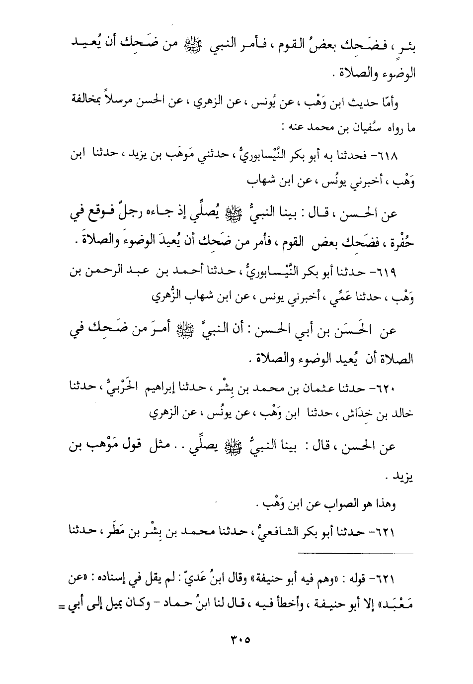 618 - فَحَدَّثَنَا بِهِ أَبُو بَكْرٍ النَّيْسَابُورِيُّ , حَدَّثَنِي مَوْهَبُ بْنُ يَزِيدَ , نا ابْنُ وَهْبٍ , أَخْبَرَنِي يُونُسُ , عَنِ ابْنِ شِهَابٍ , عَنِ الْحَسَنِ , قَالَ: بَيْنَا النَّبِيُّ صَلَّى اللهُ عَلَيْهِ وَسَلَّمَ يُصَلِّي إِذْ جَاءَهُ رَجُلٌ فَوَقَعَ فِي حُفْرَةٍ , فَضَحِكَ بَعْضُ الْقَوْمِ , فَأَمَرَ مَنْ يَضْحَكُ «أَنْ §يُعِيدَ الْوُضُوءَ وَالصَّلَاةَ»