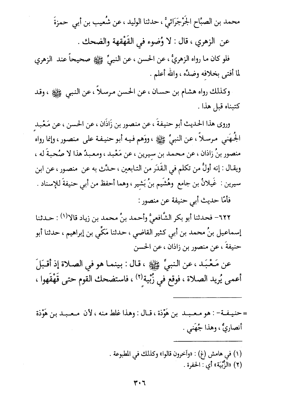 مُحَمَّدُ بْنُ الصَّبَّاحِ الْجَرْجَرَائيُّ , نا الْوَلِيدُ , ثنا شُعَيْبُ بْنُ أَبِي حَمْزَةَ , عَنِ الزُّهْرِيِّ , قَالَ: § «لَا وُضُوءَ فِي الْقَهْقَهَةِ وَالضَّحِكِ». فَلَوْ كَانَ مَا رَوَاهُ الزُّهْرِيُّ , عَنِ الْحَسَنِ , عَنِ النَّبِيِّ صَلَّى اللهُ عَلَيْهِ وَسَلَّمَ صَحِيحًا عَنِ الزُّهْرِيِّ , لَمَا أَفْتَى بِخِلَافِهِ وَضِدِّهِ وَاللَّهُ أَعْلَمُ. وَكَذَلِكَ رَوَاهُ هِشَامُ بْنُ حَسَّانَ , عَنِ الْحَسَنِ مُرْسَلًا , عَنِ النَّبِيِّ صَلَّى اللهُ عَلَيْهِ وَسَلَّمَ , وَقَدْ كَتَبْنَاهُ قَبْلَ هَذَا وَرَوَى هَذَا الْحَدِيثَ أَبُو حَنِيفَةَ , عَنْ مَنْصُورِ بْنِ زَاذَانَ , عَنِ الْحَسَنِ , عَنْ مَعْبَدٍ الْجُهَنِيِّ مُرْسَلًا , عَنِ النَّبِيِّ صَلَّى اللهُ عَلَيْهِ وَسَلَّمَ , وَوَهِمَ فِيهِ أَبُو حَنِيفَةَ عَلَى مَنْصُورٍ وَإِنَّمَا رَوَاهُ مَنْصُورُ بْنُ زَاذَانَ , عَنْ مُحَمَّدِ بْنِ سِيرِينَ , عَنْ مَعْبَدٍ , وَمَعْبَدٌ هَذَا لَا صُحْبَةَ لَهُ , وَيُقَالُ: إِنَّهُ أَوَّلُ مَنْ تَكَلَّمَ فِي الْقَدَرِ مِنَ التَّابِعِينَ , حَدَّثَ بِهِ عَنْ مَنْصُورٍ , عَنِ ابْنِ سِيرِينَ: غَيْلَانُ بْنُ جَامِعٍ , وَهُشَيْمُ بْنُ بَشِيرٍ , وَهُمَا أَحْفَظُ مِنْ أَبِي حَنِيفَةَ لِلْإِسْنَادِ
