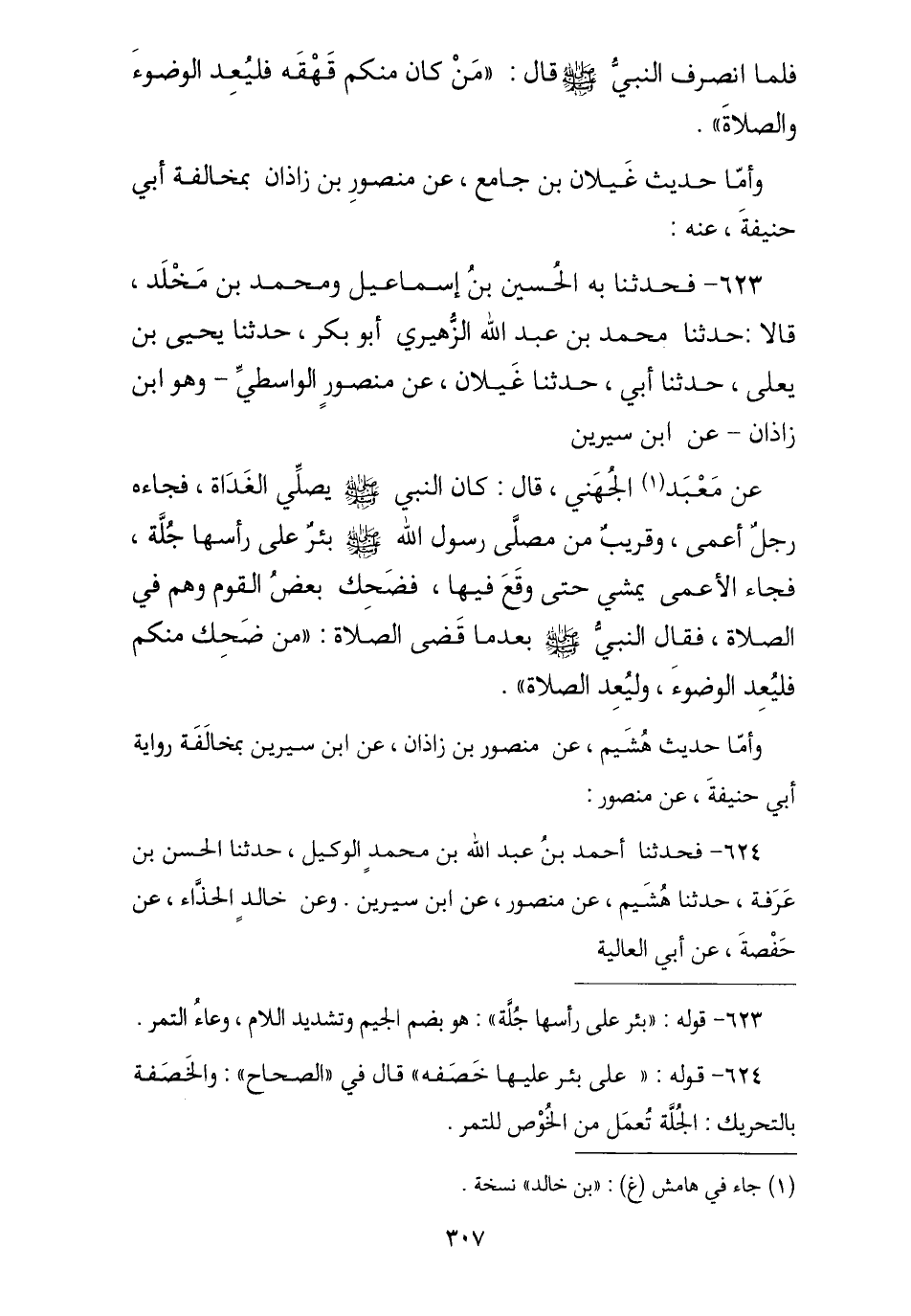 623 - فَحَدَّثَنَا بِهِ الْحُسَيْنُ بْنُ إِسْمَاعِيلَ , وَمُحَمَّدُ بْنُ مَخْلَدٍ , قَالَا: نا مُحَمَّدُ بْنُ عَبْدِ اللَّهِ الزُّهَيْرِيُّ أَبُو بَكْرٍ , نا يَحْيَى بْنُ يَعْلَى , نا أَبِي , نا غَيْلَانُ , عَنْ مَنْصُورٍ الْوَاسِطِيِّ هُوَ ابْنُ زَاذَانَ , عَنِ ابْنِ سِيرِينَ , عَنْ مَعْبَدٍ الْجُهَنِيِّ , قَالَ: كَانَ النَّبِيُّ صَلَّى اللهُ عَلَيْهِ وَسَلَّمَ يُصَلِّي الْغَدَاةَ فَجَاءَ رَجُلٌ أَعْمَى وَقَرِيبٌ مِنْ مُصَلَّى رَسُولِ اللَّهِ صَلَّى اللهُ عَلَيْهِ وَسَلَّمَ بِئْرٌ عَلَى رَأْسِهَا جُلَّةٌ , فَجَاءَ الْأَعْمَى يَمْشِي حَتَّى وَقَعَ فِيهَا , فَضَحِكَ بَعْضُ الْقَوْمِ وَهُمْ فِي الصَّلَاةِ , فَقَالَ النَّبِيُّ صَلَّى اللهُ عَلَيْهِ وَسَلَّمَ بَعْدَمَا قَضَى الصَّلَاةَ: § «مَنْ ضَحِكَ مِنْكُمْ فَلْيُعِدِ الْوُضُوءَ وَلْيُعِدِ الصَّلَاةَ»