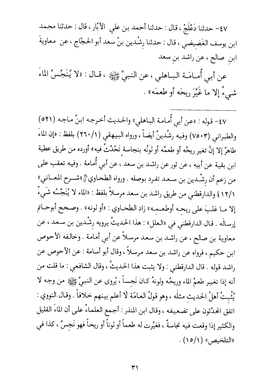 47 - حَدَّثَنَا دَعْلَجُ بْنُ أَحْمَدَ , نا أَحْمَدُ بْنُ عَلِيٍّ الْأَبَّارُ , نا مُحَمَّدُ بْنُ يُوسُفَ الْغُضَيْضِيُّ , نا رِشْدِينُ بْنُ سَعْدٍ أَبُو الْحَجَّاجِ , عَنْ مُعَاوِيَةَ بْنِ صَالِحٍ , عَنْ رَاشِدِ بْنِ سَعْدٍ , عَنْ أَبِي أُمَامَةَ الْبَاهِلِيِّ رَضِيَ اللَّهُ عَنْهُ , عَنِ النَّبِيِّ صَلَّى اللهُ عَلَيْهِ وَسَلَّمَ قَالَ: § «لَا يُنَجِّسُ الْمَاءَ شَيْءٌ إِلَّا مَا غَيَّرَ رِيحَهُ أَوْ طَعْمَهُ». -[32]- لَمْ يَرْفَعْهُ غَيْرُ رِشْدِينَ بْنِ سَعْدٍ عَنْ مُعَاوِيَةَ بْنِ صَالِحٍ وَلَيْسَ بِالْقَوِيِّ , وَالصَّوَابُ فِي قَوْلِ رَاشِدٍ