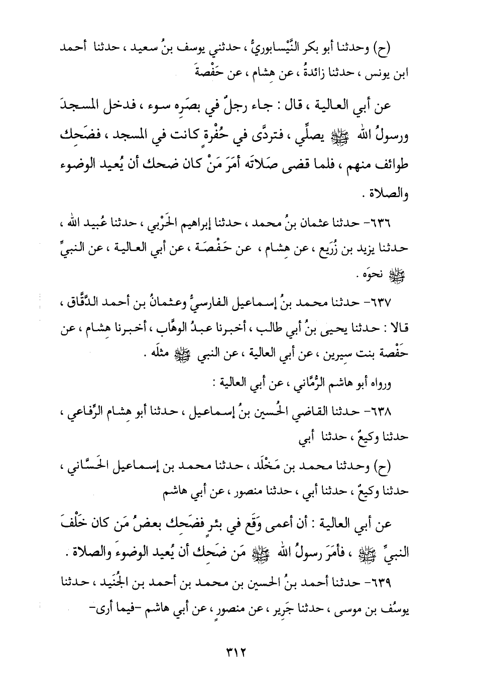 639 - حَدَّثَنَا أَحْمَدُ بْنُ الْحُسَيْنِ بْنِ مُحَمَّدِ بْنِ أَحْمَدَ بْنِ الْجُنَيْدِ , نا يُوسُفُ بْنُ مُوسَى , نا جَرِيرٌ , عَنْ مَنْصُورٍ , عَنْ أَبِي هَاشِمٍ , فِيمَا أَرَى -[313]- عَنْ أَبِي الْعَالِيَةِ , قَالَ: كَانَ النَّبِيُّ صَلَّى اللهُ عَلَيْهِ وَسَلَّمَ يُصَلِّي بِالنَّاسِ صَلَاةَ الْفَجْرِ أَوْ بَعْضَ صَلَاةِ اللَّيْلِ , وَكَانَ فِي الْمَسْجِدِ بِئْرٌ وَكَانَ رَجُلٌ فِي بَصَرِهِ ضُرٌّ فَوَقَعَ فِيهَا , فَضَحِكَ النَّاسُ , فَلَمَّا قَضَى الصَّلَاةَ قَالَ: «مِمَّا ضَحَكْتُمْ؟» فَأَخْبَرُوهُ , فَقَالَ: § «مَنْ ضَحِكَ فَلْيُعِدِ الْوُضُوءَ وَالصَّلَاةَ»