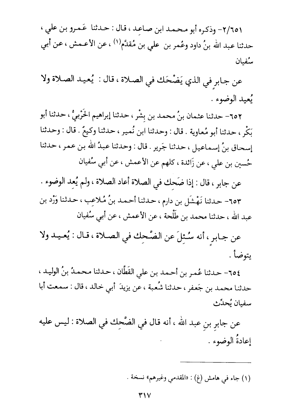 651 - وَذَكَرَهُ أَبُو مُحَمَّدِ بْنُ صَاعِدٍ , قَالَ: حَدَّثَنَا عَمْرُو بْنُ عَلِيٍّ , نا عَبْدُ اللَّهِ بْنُ دَاوُدَ , وَعُمَرُ بْنُ عَلِيٍّ الْمُقَدَّمِيُّ , عَنِ الْأَعْمَشِ , عَنْ أَبِي سُفْيَانَ , عَنْ جَابِرٍ , فِي الَّذِي يَضْحَكُ فِي الصَّلَاةِ , قَالَ: § «يُعِيدُ الصَّلَاةَ وَلَا يُعِيدُ الْوُضُوءَ»