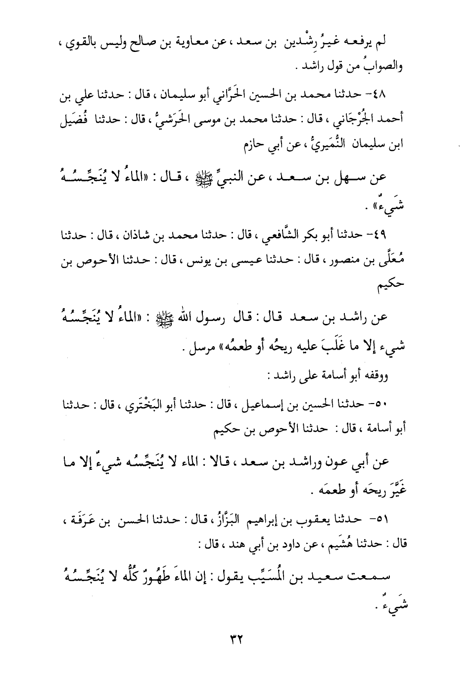 49 - حَدَّثَنَا أَبُو بَكْرٍ الشَّافِعِيُّ , نا مُحَمَّدُ بْنُ شَاذَانَ , نا مُعَلَّى بْنُ مَنْصُورٍ , نا عِيسَى بْنُ يُونُسَ , نا الْأَحْوَصُ بْنُ حَكِيمٍ , عَنْ رَاشِدِ بْنِ سَعْدٍ , قَالَ: قَالَ رَسُولُ اللَّهِ صَلَّى اللهُ عَلَيْهِ وَسَلَّمَ: § «الْمَاءُ لَا يُنَجِّسُهُ شَيْءٌ إِلَّا مَا غَلَبَ عَلَيْهِ رِيحُهُ أَوْ طَعْمُهُ». مُرْسَلٌ وَوَقَفَهُ أَبُو أُسَامَةَ عَلَى رَاشِدٍ