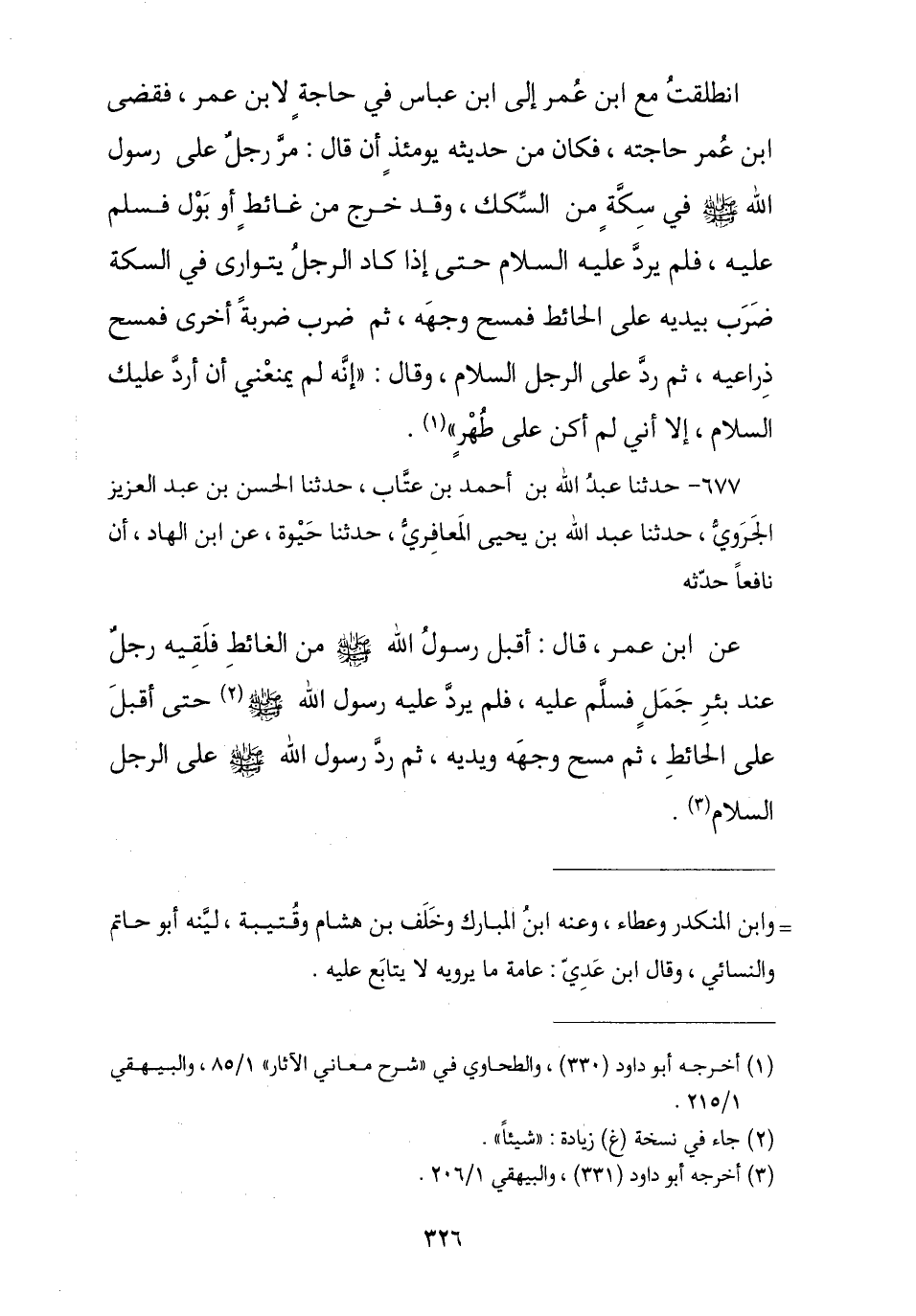 677 - حَدَّثَنَا عَبْدُ اللَّهِ بْنُ أَحْمَدَ بْنِ عَتَّابٍ , نا الْحَسَنُ بْنُ عَبْدِ الْعَزِيزِ الْجَرَوِيُّ , أَخْبَرَنَا عَبْدُ اللَّهِ بْنُ يَحْيَى الْمَعَافِرِيُّ , نا حَيْوَةُ , عَنِ ابْنِ الْهَادِ , أَنَّ نَافِعًا حَدَّثَهُ , عَنِ ابْنِ عُمَرَ , قَالَ: «أَقْبَلَ رَسُولُ اللَّهِ صَلَّى اللهُ عَلَيْهِ وَسَلَّمَ مِنَ الْغَائِطِ فَلَقِيَهُ رَجُلٌ عِنْدَ بِئْرِ جَمَلٍ , فَسَلَّمَ عَلَيْهِ فَلَمْ يَرُدَّ عَلَيْهِ رَسُولُ اللَّهِ صَلَّى اللهُ عَلَيْهِ وَسَلَّمَ , حَتَّى §أَقْبَلَ عَلَى الْحَائِطِ ثُمَّ مَسَحَ وَجْهَهُ وَيَدَيْهِ , ثُمَّ رَدَّ رَسُولُ اللَّهِ صَلَّى اللهُ عَلَيْهِ وَسَلَّمَ عَلَى الرَّجُلِ السَّلَامَ»