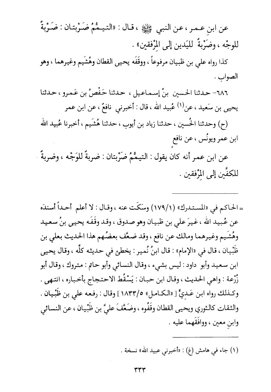 686 - حَدَّثَنَا الْحُسَيْنُ بْنُ إِسْمَاعِيلَ , نا حَفْصُ بْنُ عَمْرٍو , نا يَحْيَى بْنُ سَعِيدٍ , نا عُبَيْدُ اللَّهِ , أَخْبَرَنِي نَافِعٌ , عَنِ ابْنِ عُمَرَ , ح وَحَدَّثَنَا الْحُسَيْنُ , نا زِيَادُ بْنُ أَيُّوبَ , نا هُشَيْمٌ , نا عُبَيْدُ اللَّهِ بْنُ عُمَرَ , وَيُونُسُ , عَنْ نَافِعٍ , عَنِ ابْنِ عُمَرَ , أَنَّهُ كَانَ يَقُولُ: § «التَّيَمُّمُ ضَرْبَتَانِ ضَرْبَةً لِلْوَجْهِ وَضَرْبَةً لِلْكَفَّيْنِ إِلَى الْمِرْفَقَيْنِ»