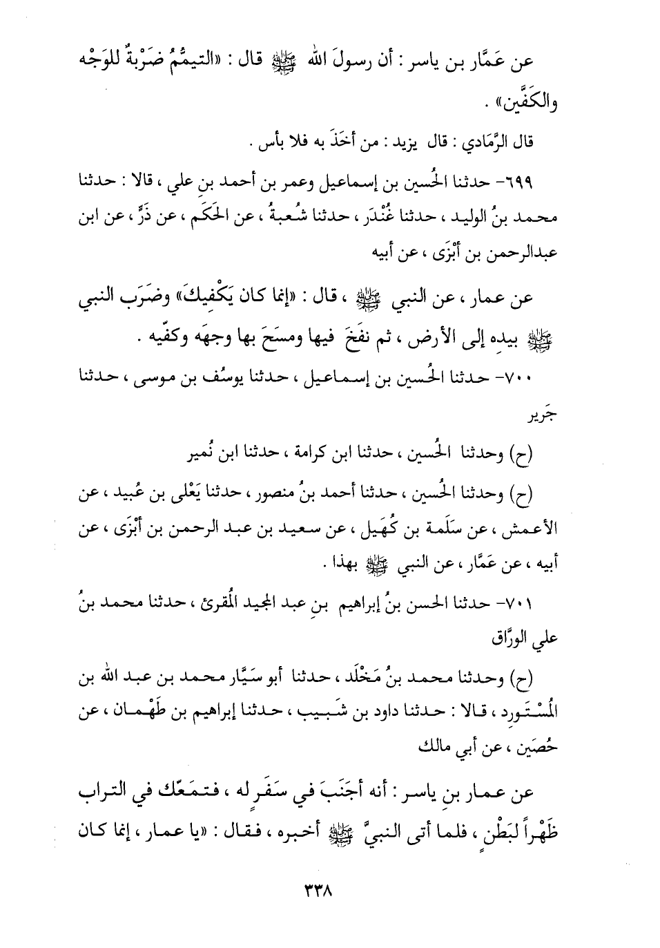 700 - حَدَّثَنَا الْحُسَيْنُ بْنُ إِسْمَاعِيلَ , وَعُمَرُ بْنُ أَحْمَدَ بْنِ عَلِيٍّ , قَالَا: نا مُحَمَّدُ بْنُ الْوَلِيدِ , نا غُنْدَرٌ , نا شُعْبَةُ , عَنِ الْحَكَمِ , عَنْ ذَرٍّ , عَنِ ابْنِ عَبْدِ الرَّحْمَنِ بْنِ أَبْزَى , عَنْ أَبِيهِ , عَنْ عَمَّارٍ , عَنِ النَّبِيِّ صَلَّى اللهُ عَلَيْهِ وَسَلَّمَ , قَالَ: § «إِنَّمَا كَانَ يَكْفِيكَ» , وَضَرَبَ النَّبِيُّ صَلَّى اللهُ عَلَيْهِ وَسَلَّمَ بِيَدِهِ الْأَرْضَ ثُمَّ نَفَخَ فِيهَا وَمَسَحَ بِهَا وَجْهَهُ وَكَفَّيْهِ.