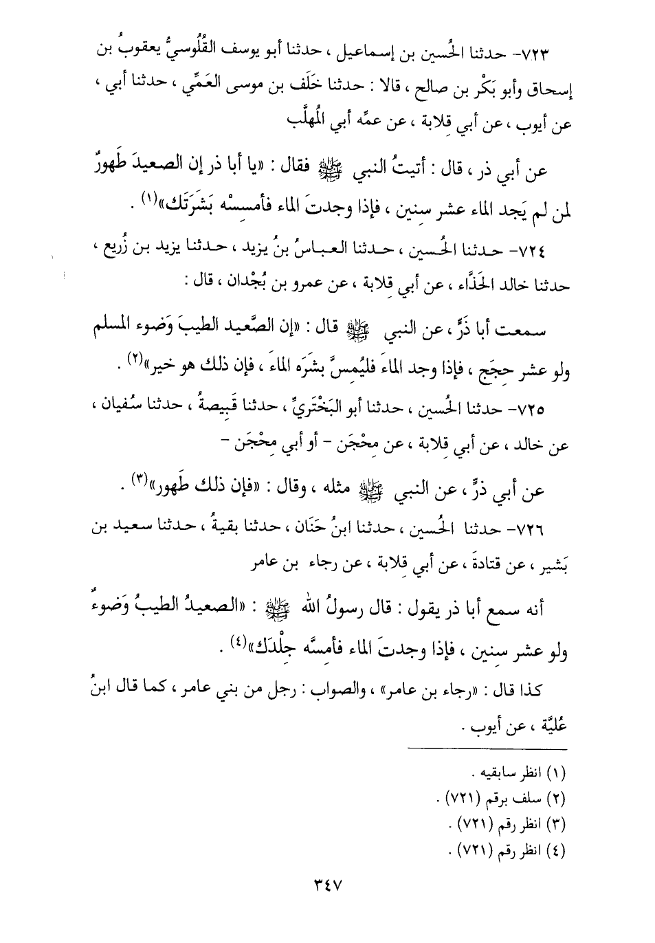 726 - حَدَّثَنَا الْحُسَيْنُ , نا ابْنُ حَنَّانٍ , قَالَ الشَّيْخُ: ابْنُ حَنَّانٍ هُوَ مُحَمَّدُ بْنُ عَمْرِو بْنِ حَنَّانٍ الْحِمْصِيُّ , ثنا بَقِيَّةُ , نا سَعِيدُ بْنُ بَشِيرٍ , عَنْ قَتَادَةَ , عَنْ أَبِي قِلَابَةَ , عَنْ رَجَاءِ بْنِ عَامِرٍ , أَنَّهُ سَمِعَ أَبَا ذَرٍّ , يَقُولُ: قَالَ رَسُولُ اللَّهِ صَلَّى اللهُ عَلَيْهِ وَسَلَّمَ: § «الصَّعِيدُ الطَّيِّبُ وُضُوءٌ وَلَوْ عَشْرَ سِنِينَ , فَإِذَا وَجَدْتَ الْمَاءَ فَامْسَسْهُ جِلْدَكَ». كَذَا قَالَ رَجَاءُ بْنُ عَامِرٍ وَالصَّوَابُ: رَجُلٌ مِنْ بَنِي عَامِرٍ , كَمَا قَالَ ابْنُ عُلَيَّةَ , عَنْ أَيُّوبَ