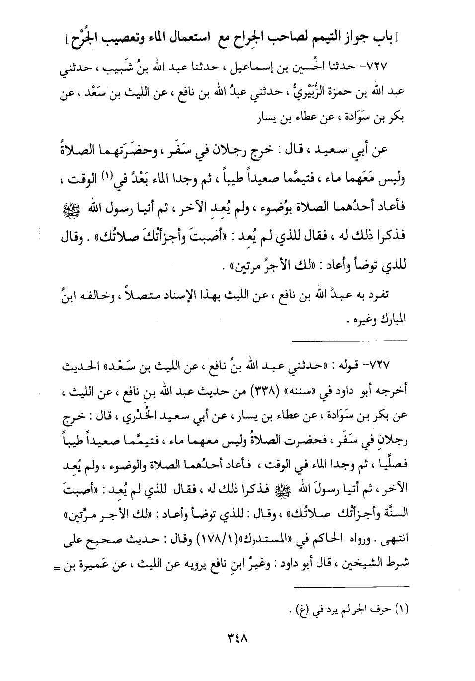 727 - حَدَّثَنَا الْحُسَيْنُ بْنُ إِسْمَاعِيلَ , نا عَبْدُ اللَّهِ بْنُ شَبِيبٍ , حَدَّثَنِي عَبْدُ اللَّهِ بْنُ حَمْزَةَ الزُّبَيْرِيُّ , حَدَّثَنِي عَبْدُ اللَّهِ بْنُ نَافِعٍ , عَنِ اللَّيْثِ بْنِ سَعْدٍ , عَنْ بَكْرِ بْنِ سَوَادَةَ , عَنْ عَطَاءِ بْنِ يَسَارٍ , عَنْ أَبِي سَعِيدٍ , قَالَ: خَرَجَ رَجُلَانِ فِي سَفَرٍ فَحَضَرَتْهُمَا الصَّلَاةُ وَلَيْسَ مَعَهُمَا مَاءٌ فَتَيَمَّمَا صَعِيدًا طَيِّبًا , ثُمَّ وَجَدَا الْمَاءَ بَعْدُ فِي الْوَقْتِ فَأَعَادَ أَحَدُهُمَا الصَّلَاةَ بِوَضُوءٍ وَلَمْ يُعِدِ الْآخَرُ , ثُمَّ أَتَيَا رَسُولَ اللَّهِ صَلَّى اللهُ عَلَيْهِ وَسَلَّمَ فَذَكَرَا ذَلِكَ لَهُ , فَقَالَ لِلَّذِي لَمْ يُعِدْ: «§أَصَبْتَ وَأَجْزَأَتْكَ صَلَاتُكَ» , وَقَالَ لِلَّذِي تَوَضَّأَ وَأَعَادَ: «لَكَ الْأَجْرُ مَرَّتَيْنِ». تَفَرَّدَ بِهِ عَبْدُ اللَّهِ بْنُ نَافِعِ , عَنِ اللَّيْثِ , بِهَذَا الْإِسْنَادِ مُتَّصِلًا وَخَالَفَهُ ابْنُ الْمُبَارَكِ وَغَيْرُهُ