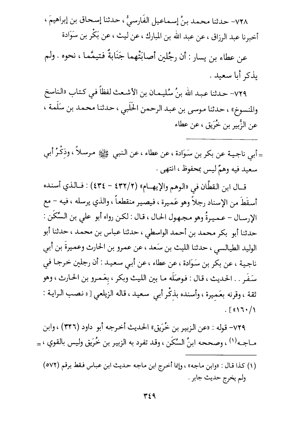 729 - حَدَّثَنَا عَبْدُ اللَّهِ بْنُ سُلَيْمَانَ بْنِ الْأَشْعَثِ لَفْظًا فِي كِتَابِ النَّاسِخِ وَالْمَنْسُوخِ , نا مُوسَى بْنُ عَبْدِ الرَّحْمَنِ الْحَلَبِيُّ , نا مُحَمَّدُ بْنُ سَلَمَةَ , عَنِ الزُّبَيْرِ بْنِ خُرَيْقٍ , عَنْ عَطَاءٍ , -[350]- عَنْ جَابِرٍ قَالَ: خَرَجْنَا فِي سَفَرٍ فَأَصَابَ رَجُلًا مِنَّا حَجَرٌ فَشَجَّهُ فِي رَأْسِهِ , ثُمَّ احْتَلَمَ فَسَأَلَ أَصْحَابَهُ هَلْ تَجِدُونَ فِيَّ رُخْصَةً فِي التَّيَمُّمِ؟ , قَالُوا: مَا نَجْدُ لَكَ رُخْصَةً وَأَنْتَ تَقْدِرُ عَلَى الْمَاءِ , فَاغْتَسَلَ فَمَاتَ فَلَمَّا قَدِمْنَا عَلَى رَسُولِ اللَّهِ صَلَّى اللهُ عَلَيْهِ وَسَلَّمَ , أُخْبِرَ بِذَلِكَ فَقَالَ: § «قَتَلُوهُ قَتَلَهُمُ اللَّهُ , أَلَا سَأَلُوا إِذَا لَمْ يَعْلَمُوا فَإِنَّمَا شِفَاءُ الْعِيِّ السُّؤَالُ , إِنَّمَا كَانَ يَكْفِيهِ أَنْ يَتَيَمَّمَ وَيَعْصِرَ أَوْ يَعْصِبَ عَلَى جَرْحِهِ ثُمَّ يَمْسَحَ عَلَيْهِ وَيَغْسِلَ سَائِرَ جَسَدِهِ». شَكَّ مُوسَى , قَالَ أَبُو بَكْرٍ: هَذِهِ سُنَّةٌ تَفَرَّدَ بِهَا أَهْلُ مَكَّةَ وَحَمَلَهَا أَهْلُ الْجَزِيرَةِ. لَمْ يَرْوِهِ عَنْ عَطَاءٍ , عَنِ جَابِرٍ غَيْرُ الزُّبَيْرِ بْنِ خُرَيْقٍ وَلَيْسَ بِالْقَوِيِّ، وَخَالَفَهُ الْأَوْزَاعِيُّ , فَرَوَاهُ عَنْ عَطَاءٍ , عَنِ ابْنِ عَبَّاسِ وَاخْتُلِفَ عَلَى الْأَوْزَاعِيِّ , فَقِيلَ عَنْهُ عَنْ عَطَاءٍ , وَقِيلَ عَنْهُ بَلَغَنِي عَنْ عَطَاءٍ , وَأَرْسَلَ الْأَوْزَاعِيُّ آخِرَهُ عَنْ عَطَاءٍ , عَنِ النَّبِيِّ صَلَّى اللهُ عَلَيْهِ وَسَلَّمَ وَهُوَ الصَّوَابُ , وَقَالَ ابْنُ أَبِي حَاتِمٍ: سَأَلْتُ أَبِي وَأَبَا زُرْعَةَ عَنْهُ فَقَالَا: رَوَاهُ ابْنُ أَبِي الْعِشْرِينَ , عَنِ الْأَوْزَاعِيِّ , عَنْ إِسْمَاعِيلَ بْنِ مُسْلِمٍ , عَنْ عَطَاءٍ , عَنِ ابْنِ عَبَّاسِ وَأَسْنَدَ الْحَدِيثَ