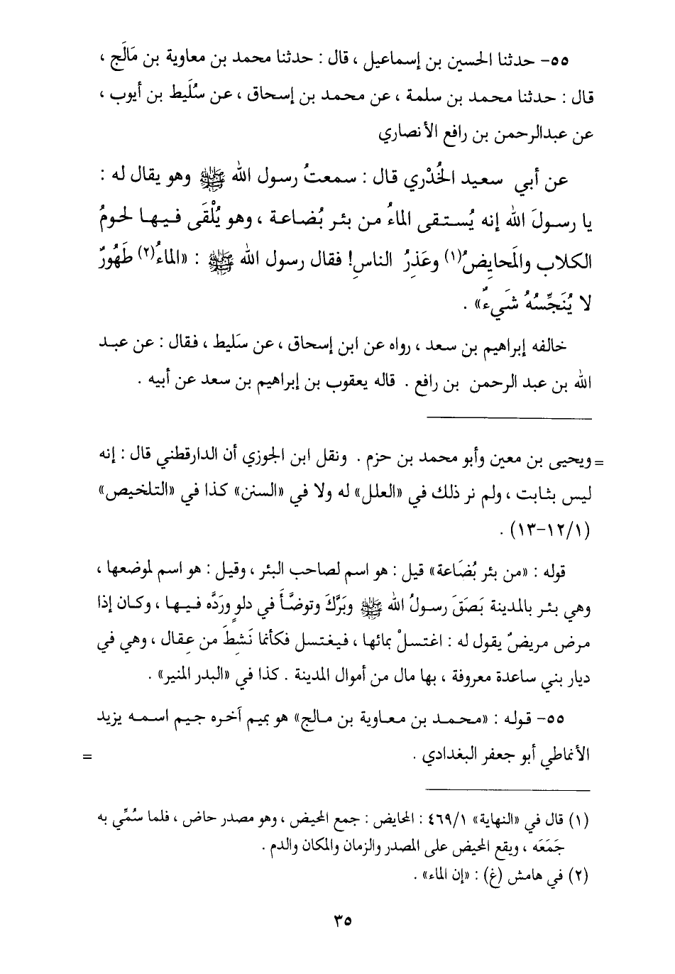55 - حَدَّثَنَا الْحُسَيْنُ بْنُ إِسْمَاعِيلَ , نا مُحَمَّدُ بْنُ مُعَاوِيَةَ بْنِ مَالَجَ , نا مُحَمَّدُ بْنُ سَلَمَةَ , عَنْ مُحَمَّدِ بْنِ إِسْحَاقَ , عَنْ سَلِيطِ بْنِ أَيُّوبَ , عَنْ عَبْدِ الرَّحْمَنِ بْنِ رَافِعٍ الْأَنْصَارِيِّ , عَنْ أَبِي سَعِيدٍ الْخُدْرِيِّ , رَضِيَ اللَّهُ عَنْهُ , قَالَ: سَمِعْتُ رَسُولَ اللَّهِ صَلَّى اللهُ عَلَيْهِ وَسَلَّمَ وَهُوَ يُقَالُ لَهُ: يَا رَسُولَ اللَّهِ إِنَّهُ لَيُسْتَقَى الْمَاءُ مِنْ بِئْرِ بُضَاعَةَ وَهِيَ يُلْقَى فِيهَا لُحُومُ الْكِلَابِ وَالْمَحَائِضُ وَعُذَرُ النَّاسِ , فَقَالَ رَسُولُ اللَّهِ صَلَّى اللهُ عَلَيْهِ وَسَلَّمَ: § «الْمَاءُ طَهُورٌ لَا يُنَجِّسُهُ شَيْءٌ». خَالَفَهُ إِبْرَاهِيمُ بْنُ سَعْدٍ , رَوَاهُ عَنِ ابْنِ إِسْحَاقَ , عَنْ سَلِيطٍ , فَقَالَ: عَنْ عُبَيْدِ اللَّهِ بْنِ عَبْدِ الرَّحْمَنِ بْنِ رَافِعٍ قَالَهُ يَعْقُوبُ بْنُ إِبْرَاهِيمَ بْنِ سَعْدٍ عَنْ أَبِيهِ