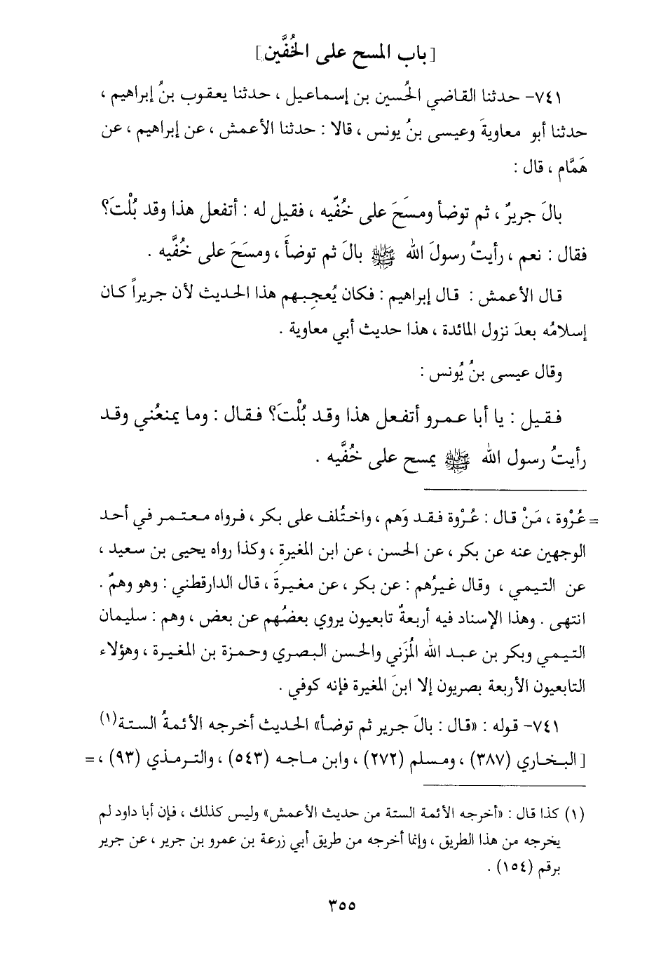 741 - حَدَّثَنَا الْقَاضِي الْحُسَيْنُ بْنُ إِسْمَاعِيلَ , نا يَعْقُوبُ بْنُ إِبْرَاهِيمَ , نا أَبُو مُعَاوِيَةَ , وَعِيسَى بْنُ يُونُسَ , قَالَا: نا الْأَعْمَشُ , عَنْ إِبْرَاهِيمَ , عَنْ هَمَّامٍ , قَالَ: بَالَ جَرِيرٌ ثُمَّ تَوَضَّأَ وَمَسَحَ عَلَى خُفَّيْهِ , فَقِيلَ لَهُ: أَتَفْعَلُ هَذَا وَقَدْ بُلْتَ؟ , قَالَ: نَعَمْ رَأَيْتُ رَسُولَ اللَّهِ صَلَّى اللهُ عَلَيْهِ وَسَلَّمَ § «بَالَ ثُمَّ تَوَضَّأَ وَمَسَحَ عَلَى خُفَّيْهِ». قَالَ الْأَعْمَشُ: قَالَ إِبْرَاهِيمُ: فَكَانَ يُعْجِبُهُمْ هَذَا الْحَدِيثُ؛ لِأَنَّ جَرِيرًا كَانَ إِسْلَامُهُ بَعْدَ نُزُولِ الْمَائِدَةِ , هَذَا حَدِيثُ أَبِي مُعَاوِيَةَ , وَقَالَ عِيسَى بْنُ يُونُسَ: فَقِيلَ لَهُ: يَا أَبَا عَمْرٍو أَتَفْعَلُ هَذَا وَقَدْ بُلْتَ؟ , فَقَالَ: وَمَا يَمْنَعُنِي وَقَدْ رَأَيْتُ رَسُولَ اللَّهِ صَلَّى اللهُ عَلَيْهِ وَسَلَّمَ يَمْسَحُ عَلَى خُفَّيْهِ. -[356]- وَكَانَ أَصْحَابُ عَبْدِ اللَّهِ يُعْجِبُهُمْ ذَلِكَ لِأَنَّ إِسْلَامَهُ كَانَ بَعْدَ نُزُولِ الْمَائِدَةِ
