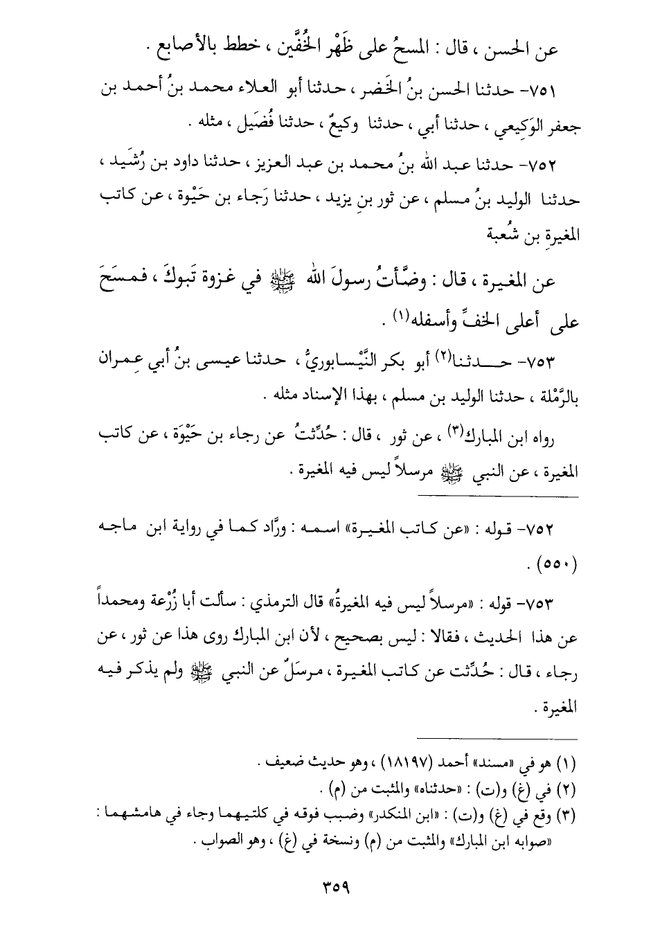 753 - حَدَّثَنَا أَبُو بَكْرٍ النَّيْسَابُورِيُّ , نا عِيسَى بْنُ أَبِي عِمْرَانَ بِالرَّمْلَةِ , ثنا الْوَلِيدُ بْنُ مُسْلِمٍ , بِهَذَا الْإِسْنَادِ مِثْلَهُ. رَوَاهُ ابْنُ الْمُبَارَكِ , عَنْ ثَوْرٍ , قَالَ: حُدِّثْتُ عَنْ رَجَاءِ بْنِ حَيْوَةَ , عَنْ كَاتِبِ الْمُغِيرَةِ , عَنِ النَّبِيِّ صَلَّى اللهُ عَلَيْهِ وَسَلَّمَ مُرْسَلًا لَيْسَ فِيهِ الْمُغِيرَةُ