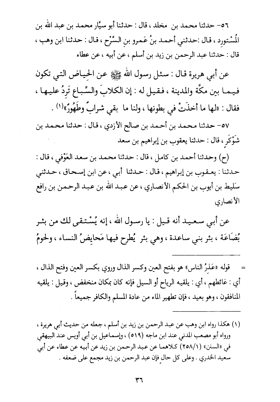 56 - حَدَّثَنَا مُحَمَّدُ بْنُ مَخْلَدٍ , نا أَبُو سَيَّارٍ مُحَمَّدُ بْنُ عَبْدِ اللَّهِ بْنِ الْمُسْتَوْرِدِ , حَدَّثَنِي أَحْمَدُ بْنُ عَمْرِو بْنِ سَرْحٍ , نا ابْنُ وَهْبٍ , نا عَبْدُ الرَّحْمَنِ بْنُ زَيْدِ بْنِ أَسْلَمَ , عَنْ أَبِيهِ , عَنْ عَطَاءٍ , عَنْ أَبِي هُرَيْرَةَ , رَضِيَ اللَّهُ عَنْهُ قَالَ: سُئِلَ رَسُولُ اللَّهِ صَلَّى اللهُ عَلَيْهِ وَسَلَّمَ عَنِ الْحِيَاضِ الَّتِي تَكُونُ فِيمَا بَيْنَ مَكَّةَ وَالْمَدِينَةِ فَقِيلَ لَهُ: إِنَّ الْكِلَابَ وَالسِّبَاعَ تَرِدُ عَلَيْهَا فَقَالَ: § «لَهَا مَا أَخَذَتْ فِي بُطُونِهَا وَلَنَا مَا بَقِيَ شَرَابٌ وَطَهُورٌ»