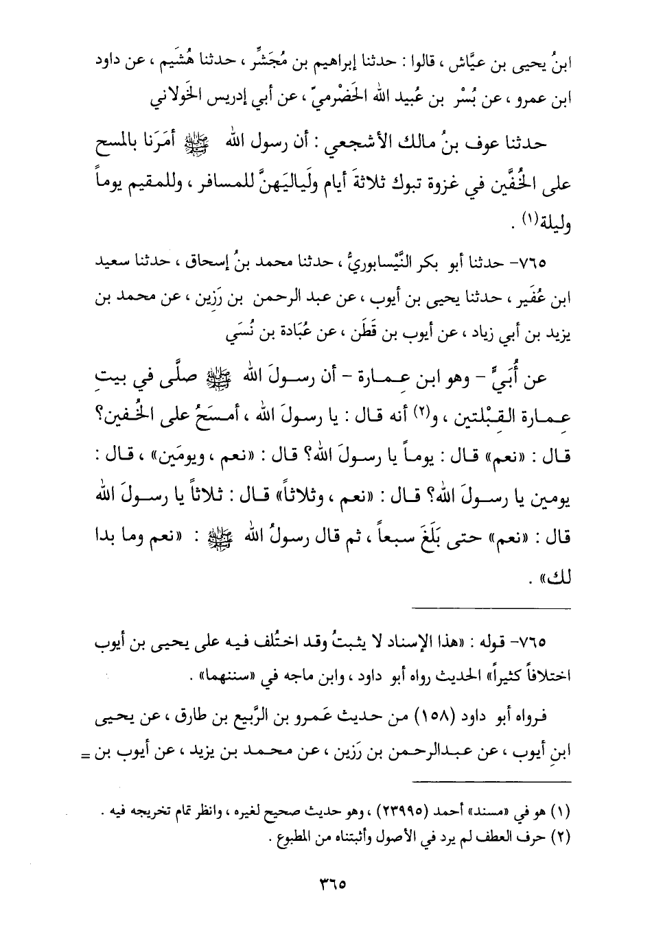 765 - حَدَّثَنَا أَبُو بَكْرٍ النَّيْسَابُورِيُّ , نا مُحَمَّدُ بْنُ إِسْحَاقَ , نا سَعِيدُ بْنُ عُفَيْرٍ , نا يَحْيَى بْنُ أَيُّوبَ , عَنْ عَبْدِ الرَّحْمَنِ بْنِ رَزِينٍ , عَنْ مُحَمَّدِ بْنِ يَزِيدَ بْنِ أَبِي زِيَادٍ , عَنْ أَيُّوبَ بْنِ قَطَنٍ , عَنْ عُبَادَةَ بْنِ نُسِيٍّ , عَنْ أَبِي هُوَ ابْنُ عُمَارَةَ , أَنَّ رَسُولَ اللَّهِ صَلَّى اللهُ عَلَيْهِ وَسَلَّمَ صَلَّى فِي بَيْتِ عُمَارَةَ الْقِبْلَتَيْنِ , وَأَنَّهُ قَالَ: يَا رَسُولَ اللَّهِ §أَمْسَحُ عَلَى الْخُفَّيْنِ؟ , قَالَ: «نَعَمْ» , قَالَ: يَوْمًا يَا رَسُولَ اللَّهِ صَلَّى اللهُ عَلَيْهِ وَسَلَّمَ؟ , قَالَ: «نَعَمْ» , قَالَ: وَيَوْمَيْنِ يَا رَسُولَ اللَّهِ؟ , قَالَ: «نَعَمْ وَثَلَاثًا» , قَالَ: ثَلَاثًا يَا رَسُولَ اللَّهِ؟ حَتَّى بَلَغَ سَبْعًا , ثُمَّ قَالَ رَسُولُ اللَّهِ صَلَّى اللهُ عَلَيْهِ وَسَلَّمَ: «وَمَا بَدَا لَكَ». -[366]- هَذَا الْإِسْنَادُ لَا يُثْبَتُ وَقَدِ اخْتُلِفَ فِيهِ عَلَى يَحْيَى بْنِ أَيُّوبَ اخْتِلَافًا كَثِيرًا قَدْ بَيَّنْتُهُ فِي مَوْضِعٍ آخَرَ , وَعَبْدُ الرَّحْمَنِ , وَمُحَمَّدُ بْنُ يَزِيدَ , وَأَيُّوبُ بْنُ قَطَنٍ مَجْهُولُونَ كُلُّهُمْ وَاللَّهُ أَعْلَمُ