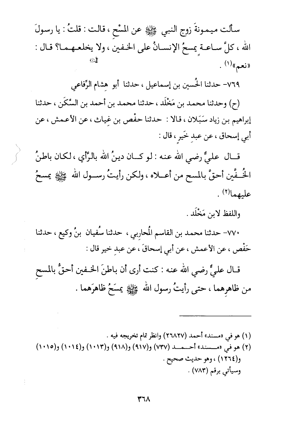 769 - حَدَّثَنَا الْحُسَيْنُ بْنُ إِسْمَاعِيلَ , حَدَّثَنَا أَبُو هِشَامٍ الرِّفَاعِيُّ , ح وَحَدَّثَنَا مُحَمَّدُ بْنُ مَخْلَدٍ , نا مُحَمَّدُ بْنُ أَحْمَدَ بْنِ السَّكَنِ , نا إِبْرَاهِيمُ بْنُ زِيَادٍ سَبَلَانُ , قَالَا: نا حَفْصُ بْنُ غِيَاثٍ , عَنِ الْأَعْمَشِ , عَنْ أَبِي إِسْحَاقَ , عَنْ عَبْدِ خَيْرٍ , قَالَ: قَالَ عَلِيٌّ: لَوْ كَانَ دِينُ اللَّهِ بِالرَّأْيِ لَكَانَ §بَاطِنُ الْخُفَّيْنِ أَحَقَّ بِالْمَسْحِ مِنْ أَعْلَاهُ , وَلَكِنْ «رَأَيْتُ رَسُولَ اللَّهِ صَلَّى اللهُ عَلَيْهِ وَسَلَّمَ يَمْسَحُ عَلَيْهِمَا». وَاللَّفْظُ لِابْنِ مَخْلَدٍ