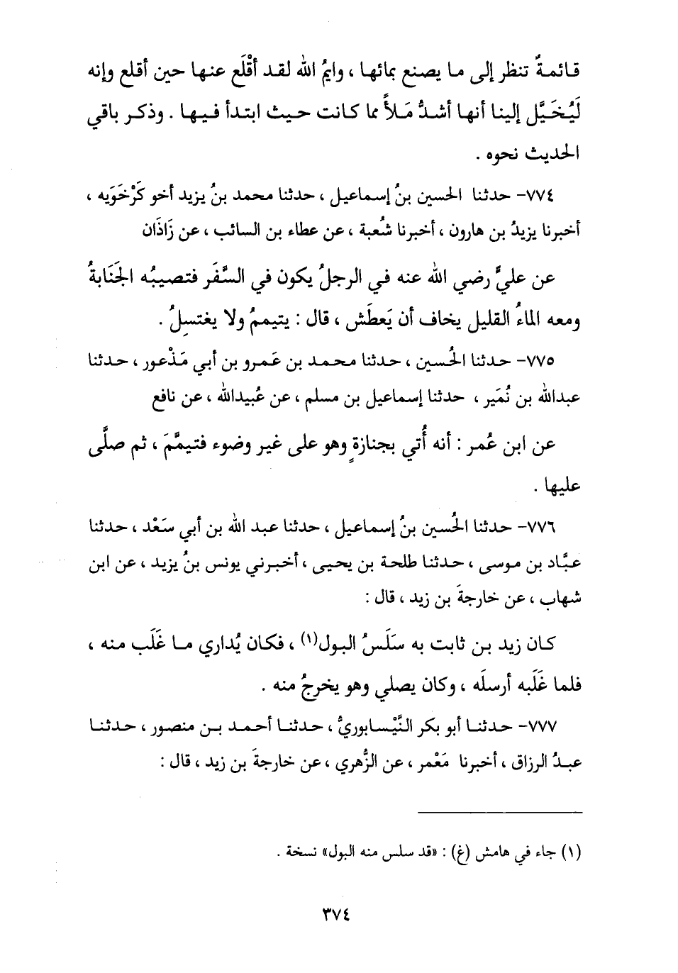 776 - حَدَّثَنَا الْحُسَيْنُ بْنُ إِسْمَاعِيلَ , نا عَبْدُ اللَّهِ بْنُ أَبِي سَعْدٍ , نا عَبَّادُ بْنُ مُوسَى , نا طَلْحَةُ بْنُ يَحْيَى , حَدَّثَنِي يُونُسُ بْنُ يَزِيدَ , عَنِ ابْنِ شِهَابٍ , عَنْ خَارِجَةَ بْنِ زَيْدٍ , قَالَ: -[375]- كَانَ زَيْدُ بْنُ ثَابِتٍ § «قَدْ سَلَسَ مِنْهُ الْبَوْلُ , فَكَانَ يُدَارِي مَا غَلَبَهُ مِنْهُ فَلَمَّا غَلَبَهُ أَرْسَلَهُ , وَكَانَ يُصَلِّي وَهُوَ يَخْرُجُ مِنْهُ»