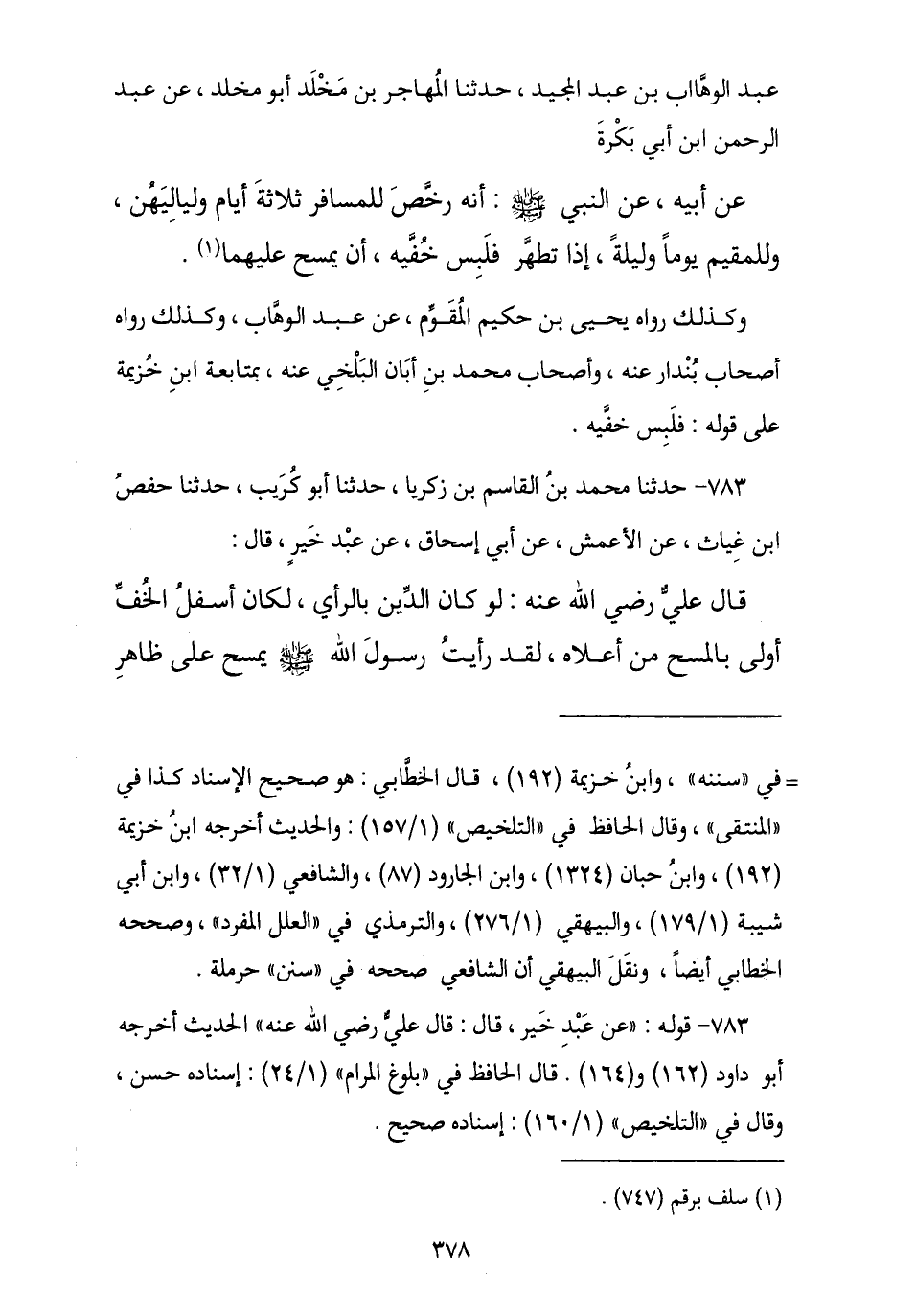 783 - حَدَّثَنَا مُحَمَّدُ بْنُ الْقَاسِمِ بْنِ زَكَرِيَّا , ثنا أَبُو كُرَيْبٍ , ثنا حَفْصُ بْنُ غِيَاثٍ , عَنِ الْأَعْمَشِ , عَنْ أَبِي إِسْحَاقَ , عَنْ عَبْدِ خَيْرٍ , قَالَ: قَالَ عَلِيٌّ رَضِيَ اللَّهُ عَنْهُ: لَوْ كَانَ الدِّينُ بِالرَّأْيِ لَكَانَ أَسْفَلُ الْخُفِّ أَوْلَى بِالْمَسْحِ مِنْ أَعْلَاهُ , «لَقَدْ رَأَيْتُ رَسُولَ اللَّهِ صَلَّى اللهُ عَلَيْهِ وَسَلَّمَ §يَمْسَحُ عَلَى ظَاهَرِ -[379]- خُفَّيْهِ»