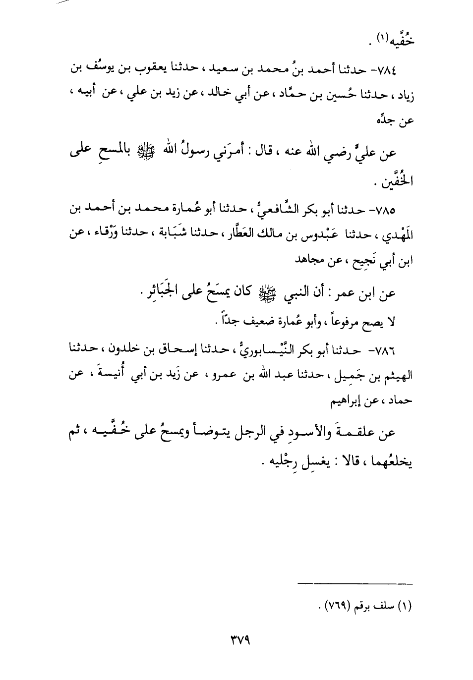 784 - نا أَحْمَدُ بْنُ مُحَمَّدِ بْنِ سَعِيدٍ , نا يَعْقُوبُ بْنُ يُوسُفَ بْنِ زِيَادٍ , نا حُسَيْنُ بْنُ حَمَّادٍ , عَنْ أَبِي خَالِدٍ , عَنْ زَيْدِ بْنِ عَلِيٍّ , عَنْ أَبِيهِ , عَنْ جَدِّهِ , عَنْ عَلِيٍّ , رَضِيَ اللَّهُ عَنْهُ , قَالَ: أَمَرَنِي رَسُولُ اللَّهِ صَلَّى اللهُ عَلَيْهِ وَسَلَّمَ § «بِالْمَسْحِ عَلَى الْخُفَّيْنِ»
