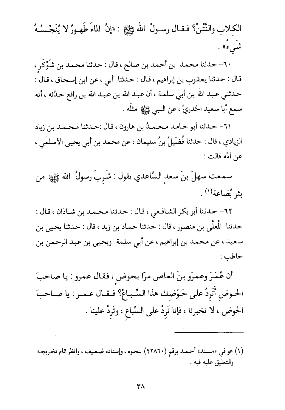 62 - حَدَّثَنَا أَبُو بَكْرٍ الشَّافِعِيُّ , نا مُحَمَّدُ بْنُ شَاذَانَ , نا الْمُعَلَّى بْنُ مَنْصُورٍ , نا حَمَّادُ بْنُ زَيْدٍ , نا يَحْيَى بْنُ سَعِيدٍ , عَنْ مُحَمَّدِ بْنِ إِبْرَاهِيمَ , عَنْ أَبِي سَلَمَةَ , وَيَحْيَى بْنِ عَبْدِ الرَّحْمَنِ بْنِ حَاطِبٍ , أَنَّ عُمَرَ , وَعَمْرَو بْنَ الْعَاصِ , رَضِيَ اللَّهُ عَنْهُمَا مَرَّا بِحَوْضٍ , فَقَالَ عَمْرٌو: «يَا صَاحِبَ الْحَوْضِ §أَتَرِدُ عَلَى حَوْضِكَ هَذَا السِّبَاعُ»؟ , فَقَالَ عُمَرُ: «يَا صَاحِبَ الْحَوْضِ لَا تُخْبِرْنَا فَإِنَّا نَرِدُ عَلَى السِّبَاعِ وَتَرِدُ عَلَيْنَا»