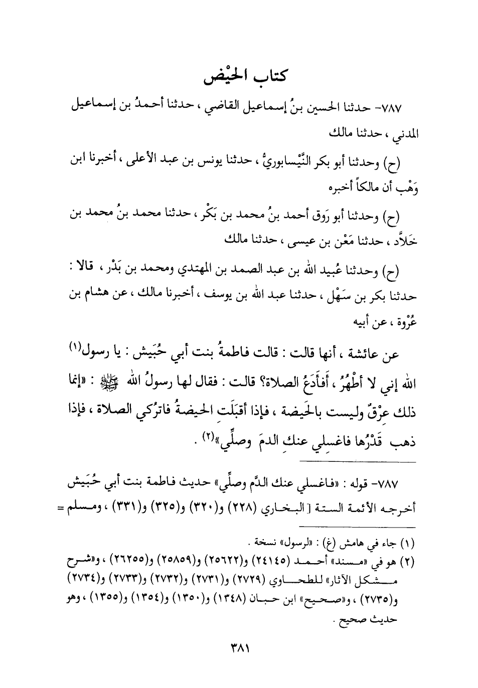 787 - حَدَّثَنَا الْحُسَيْنُ بْنُ إِسْمَاعِيلَ , ثنا أَحْمَدُ بْنُ إِسْمَاعِيلَ الْمَدَنِيُّ , ثنا مَالِكٌ , ح وَحَدَّثَنَا أَبُو بَكْرٍ النَّيْسَابُورِيُّ , ثنا يُونُسُ بْنُ عَبْدِ الْأَعْلَى , نا ابْنُ وَهْبٍ , أَنَّ مَالِكًا أَخْبَرَهُ ح , وَحَدَّثَنَا أَبُو رَوْقٍ أَحْمَدُ بْنُ مُحَمَّدِ بْنِ بَكْرٍ نا مُحَمَّدُ بْنُ مُحَمَّدِ بْنِ خَلَّادٍ , ثنا مَعْنُ بْنُ عِيسَى , ثنا مَالِكٌ , ح وَحَدَّثَنَا عُبَيْدُ اللَّهِ بْنُ عَبْدِ الصَّمَدِ بْنِ الْمُهْتَدِي , وَمُحَمَّدُ بْنُ بَدْرٍ , قَالَا: نا بَكْرُ بْنُ سَهْلٍ , نا عَبْدُ اللَّهِ بْنُ يُوسُفَ , أنا مَالِكٌ , عَنْ هِشَامِ بْنِ عُرْوَةَ , عَنْ أَبِيهِ , عَنْ عَائِشَةَ , أَنَّهَا قَالَتْ: قَالَتْ فَاطِمَةُ بِنْتُ أَبِي حُبَيْشٍ لِرَسُولِ اللَّهِ صَلَّى اللهُ عَلَيْهِ وَسَلَّمَ: يَا رَسُولَ اللَّهِ صَلَّى اللهُ عَلَيْهِ وَسَلَّمَ إِنِّي لَا أَطْهُرُ أَفَأَدَعُ الصَّلَاةَ , قَالَتْ: فَقَالَ لَهَا رَسُولُ اللَّهِ صَلَّى اللهُ عَلَيْهِ وَسَلَّمَ: «إِنَّمَا §ذَلِكَ عِرْقٌ وَلَيْسَ بِالْحَيْضَةِ , فَإِذَا أَقْبَلَتِ الْحَيْضَةُ فَاتْرُكِي الصَّلَاةَ , فَإِذَا ذَهَبَ قَدْرُهَا فَاغْسِلِي عَنْكِ الدَّمَ وَصَلِّي»