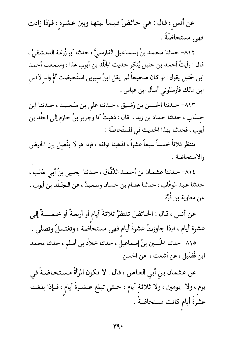813 - حَدَّثَنَا الْحَسَنُ بْنُ رَشِيقٍ , نا عَلِيُّ بْنُ سَعِيدٍ , ثنا ابْنُ حِسَابٍ , ثنا حَمَّادُ بْنُ زَيْدٍ , قَالَ: ذَهَبْتُ أَنَا وَجَرِيرُ بْنُ حَازِمٍ إِلَى الْجَلْدِ بْنِ أَيُّوبَ فَحَدَّثَنَا بِهَذَا الْحَدِيثِ , فِي §الْمُسْتَحَاضَةِ «تَنْتَظِرُ ثَلَاثًا , خَمْسًا , سَبْعًا , عَشْرًا» , فَذَهَبْنَا نُوِفِقُهُ , فَإِذَا هُوَ لَا يَفْصِلُ بَيْنَ الْحَيْضِ وَالِاسْتِحَاضَةِ