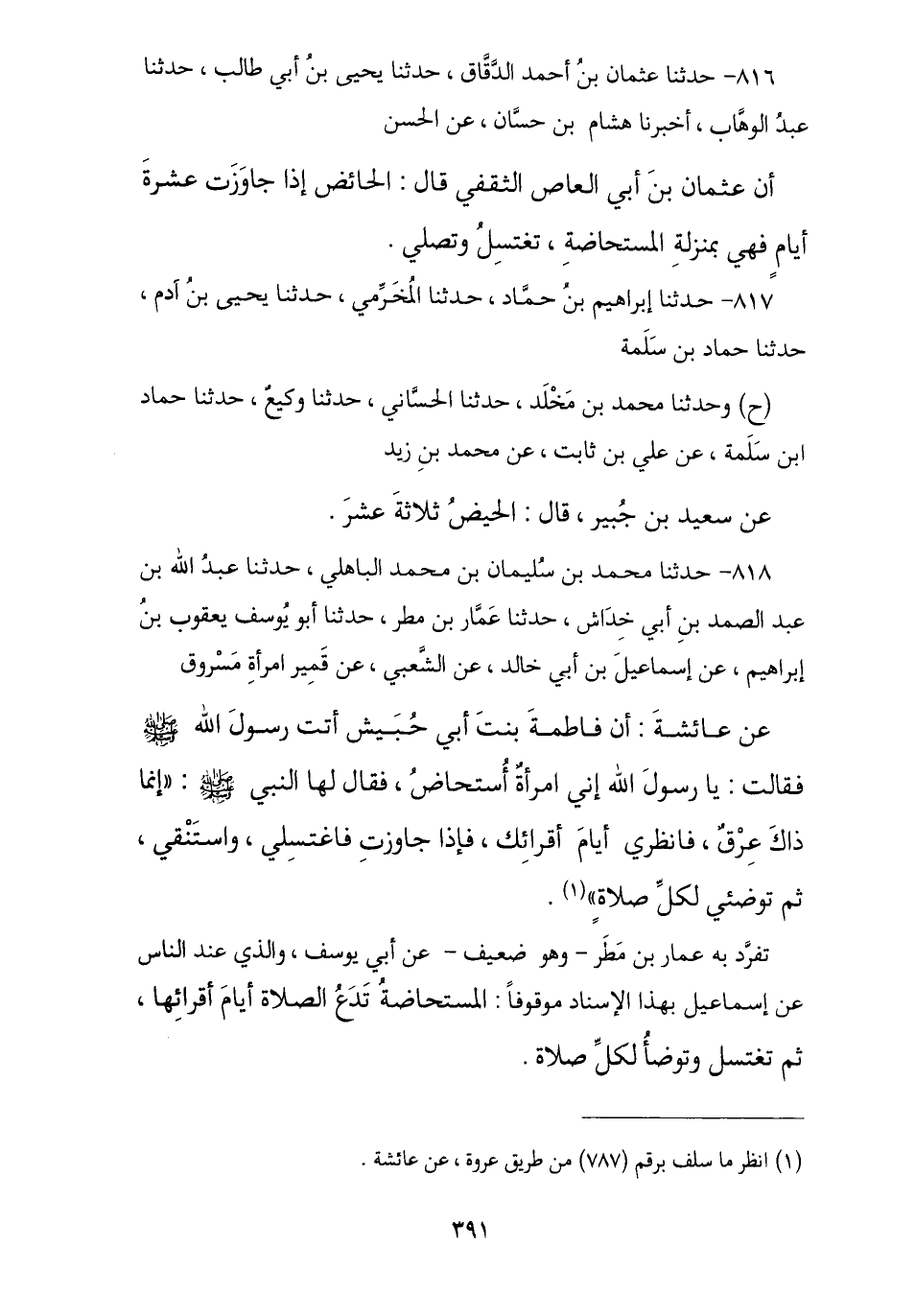 818 - حَدَّثَنَا مُحَمَّدُ بْنُ سُلَيْمَانَ بْنِ مُحَمَّدٍ الْبَاهِلِيُّ , نا عَبْدُ اللَّهِ بْنُ عَبْدِ الصَّمَدِ بْنِ أَبِي خِدَاشٍ , نا عَمَّارُ بْنُ مَطَرٍ , نا أَبُو يُوسُفَ يَعْقُوبُ بْنُ إِبْرَاهِيمَ , عَنْ إِسْمَاعِيلَ بْنِ أَبِي خَالِدٍ , عَنِ الشَّعْبِيِّ , عَنْ قَمِيرٍ امْرَأَةِ مَسْرُوقٍ , عَنْ عَائِشَةَ أَنَّ فَاطِمَةَ بِنْتِ أَبِي حُبَيْشٍ أَتَتْ رَسُولَ اللَّهِ صَلَّى اللهُ عَلَيْهِ وَسَلَّمَ فَقَالَتْ: يَا رَسُولَ اللَّهِ إِنِّي امْرَأَةٌ أُسْتَحَاضُ , فَقَالَ لَهَا النَّبِيُّ صَلَّى اللهُ عَلَيْهِ وَسَلَّمَ: «إِنَّمَا §ذَاكَ عِرْقٌ فَانْظُرِي أَيَّامَ إِقْرَائِكِ فَإِذَا جَاوَزَتْ فَاغْتَسِلِي وَاسْتَنْقِي , ثُمَّ تَوَضَّئِي لِكُلِّ صَلَاةٍ» تَفَرَّدَ بِهِ عَمَّارُ بْنُ مَطَرٍ وَهُوَ ضَعِيفٌ , عَنْ أَبِي يُوسُفَ , وَالَّذِي عِنْدَ النَّاسِ عَنْ إِسْمَاعِيلَ بِهَذَا الْإِسْنَادِ مَوْقُوفًا: «الْمُسْتَحَاضَةُ تَدَعُ الصَّلَاةَ أَيَّامَ أَقْرَائِهَا , ثُمَّ تَغْتَسِلُ وَتَتَوَضَّأُ لِكُلِّ صَلَاةٍ»