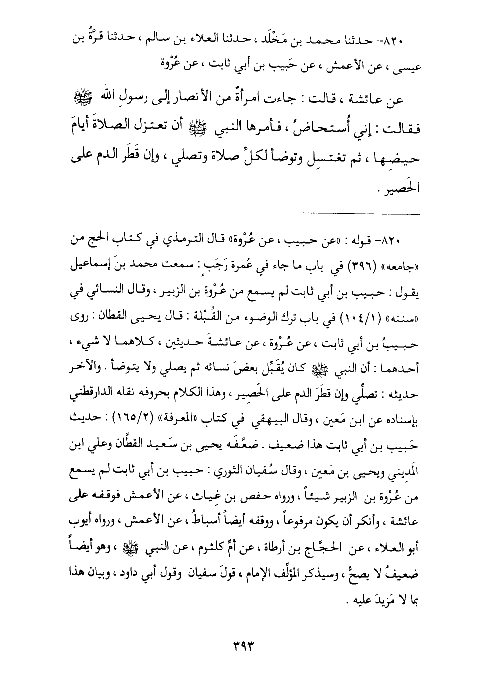 820 - حَدَّثَنَا مُحَمَّدُ بْنُ مَخْلَدٍ , نا الْعَلَاءُ بْنُ سَالِمٍ , نا قُرَّةُ بْنُ عِيسَى , عَنِ الْأَعْمَشِ , عَنْ حَبِيبِ بْنِ أَبِي ثَابِتٍ , عَنْ عُرْوَةَ , عَنْ عَائِشَةَ , قَالَتْ: جَاءَتِ امْرَأَةٌ مِنَ الْأَنْصَارِ إِلَى رَسُولِ اللَّهِ صَلَّى اللهُ عَلَيْهِ وَسَلَّمَ , فَقَالَتْ: إِنِّي أُسْتَحَاضُ , فَأَمَرَهَا النَّبِيُّ صَلَّى اللهُ عَلَيْهِ وَسَلَّمَ «أَنْ §تَعْتَزِلَ الصَّلَاةَ أَيَّامَ حَيْضَتِهَا , ثُمَّ تَغْتَسِلُ وَتَتَوَضَّأُ لِكُلِّ صَلَاةٍ وَتُصَلِّي وَإِنْ قَطَرَ الدَّمُ عَلَى الْحَصِيرِ»