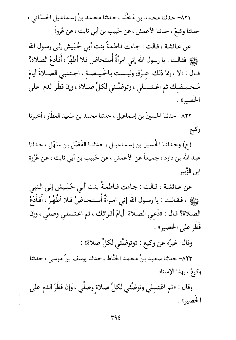822 - حَدَّثَنَا الْحُسَيْنُ بْنُ إِسْمَاعِيلَ , نا مُحَمَّدُ بْنُ سَعِيدٍ الْعَطَّارُ , أنا وَكِيعٌ , ح وَحَدَّثَنَا الْحُسَيْنُ بْنُ إِسْمَاعِيلَ , نا الْفَضْلُ بْنُ سَهْلٍ , ثنا عَبْدُ اللَّهِ بْنُ دَاوُدَ , جَمِيعًا عَنِ الْأَعْمَشِ , عَنْ حَبِيبِ بْنِ أَبِي ثَابِتٍ , عَنْ عُرْوَةَ بْنِ الزُّبَيْرِ , عَنْ عَائِشَةَ , قَالَتْ: جَاءَتْ فَاطِمَةُ بِنْتُ أَبِي حُبَيْشٍ إِلَى النَّبِيِّ صَلَّى اللهُ عَلَيْهِ وَسَلَّمَ قَالَتْ: يَا رَسُولَ اللَّهِ إِنِّي امْرَأَةٌ أُسْتَحَاضُ فَلَا أَطْهُرُ أَفَأَدَعُ الصَّلَاةَ , فَقَالَ: § «دَعِي الصَّلَاةَ أَيَّامَ أَقْرَائِكِ , ثُمَّ اغْتَسِلِي وَصَلِّي وَإِنْ قَطَرَ الدَّمُ عَلَى الْحَصِيرِ»، وَقَالَ غَيْرُهُ , عَنْ وَكِيعٍ: «وَتَوَضَّئِي لِكُلِّ صَلَاةٍ».