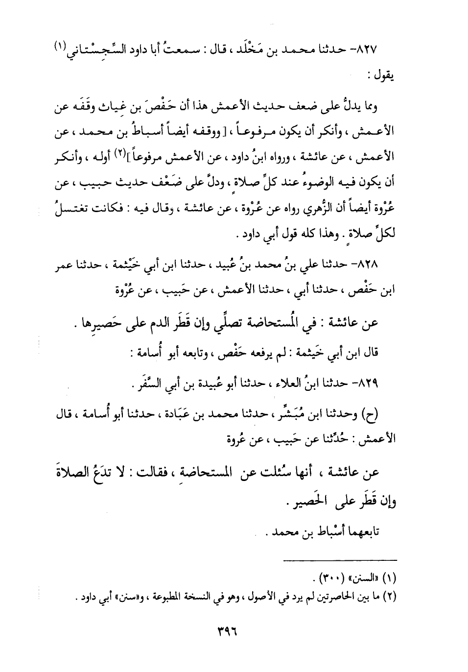 829 - حَدَّثَنَا ابْنُ الْعَلَاءِ , ثنا أَبُو عُبَيْدَةَ بْنُ أَبِي السَّفَرِ , ح وَحَدَّثَنَا ابْنُ مُبَشِّرٍ , ثنا مُحَمَّدُ بْنُ عُبَادَةَ , قَالَا: ثنا أَبُو أُسَامَةَ , قَالَ الْأَعْمَشُ , ثنا عَنْ حَبِيبٍ , عَنْ عُرْوَةَ , عَنْ عَائِشَةَ , أَنَّهَا سُئِلَتْ عَنِ الْمُسْتَحَاضَةِ , فَقَالَتْ: § «لَا تَدَعُ الصَّلَاةَ وَإِنْ قَطَرَ الدَّمُ عَلَى الْحَصِيرِ». تَابَعَهُمَا أَسْبَاطُ بْنُ مُحَمَّدٍ