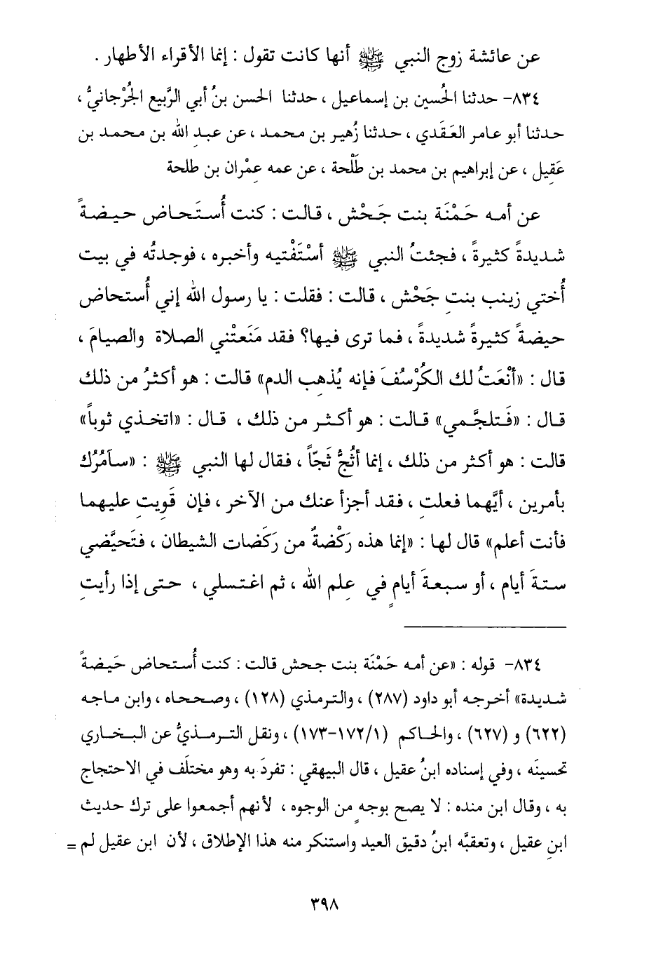 834 - حَدَّثَنَا الْحُسَيْنُ بْنُ إِسْمَاعِيلَ , ثنا الْحُسَيْنُ بْنُ أَبِي الرَّبِيعِ الْجُرْجَانِيُّ , ثنا أَبُو عَامِرٍ الْعَقَدِيُّ , ثنا زُهَيْرُ بْنُ مُحَمَّدٍ , عَنْ عَبْدِ اللَّهِ بْنِ مُحَمَّدِ بْنِ عَقِيلٍ , عَنْ إِبْرَاهِيمَ بْنِ مُحَمَّدِ بْنِ طَلْحَةَ , عَنْ عَمِّهِ عِمْرَانَ بْنِ طَلْحَةَ , عَنْ أُمِّهِ حَمْنَةَ بِنْتِ جَحْشٍ , قَالَتْ: كُنْتُ أُسْتَحَاضُ حَيْضَةً شَدِيدَةً كَثِيرَةً , فَجِئْتُ النَّبِيَّ صَلَّى اللهُ عَلَيْهِ وَسَلَّمَ أَسْتَفْتِيهِ فَأُخْبِرُهُ فَوَجَدْتُهُ فِي بَيْتِ أُخْتِي زَيْنَبَ بِنْتِ جَحْشٍ , قَالَتْ: فَقُلْتُ: يَا رَسُولَ اللَّهِ إِنِّي أُسْتَحَاضُ حَيْضَةً كَبِيرَةً شَدِيدَةً فَمَا تَرَى فِيهَا؟ فَقَدْ مَنَعْتَنِي الصَّلَاةَ وَالصِّيَامَ , قَالَ: «§أَنْعَتُ لَكِ الْكُرْسُفَ فَإِنَّهُ يُذْهِبُ الدَّمَ» , قَالَتْ: هُوَ أَكْثَرُ مِنْ ذَلِكَ , قَالَ: «فَتَلَجَّمِي» , قَالَتْ: هُوَ أَكْثَرُ مِنْ ذَلِكَ , قَالَ: «اتَّخِذِي ثَوْبًا» , قَالَتْ: هُوَ أَكْثَرُ مِنْ ذَلِكَ إِنَّمَا أَثُجُّ ثَجًّا , فَقَالَ لَهَا النَّبِيُّ صَلَّى اللهُ عَلَيْهِ وَسَلَّمَ: «سَآمُرُكِ بِأَمْرَيْنِ أَيَّتَهُمَا فَعَلْتِ فَقَدْ أَجْزَأَ عَنْكِ مِنَ الْآخَرِ , فَإِنْ قَوَيْتِ عَلَيْهِمَا فَأَنْتِ أَعْلَمُ» قَالَ لَهَا: «إِنَّمَا هَذِهِ رَكْضَةٌ مِنْ رَكَضَاتِ الشَّيْطَانِ , فَتَحَيَّضِي سِتَّةَ أَيَّامٍ أَوْ سَبْعَةَ أَيَّامٍ فِي عِلْمِ اللَّهِ , ثُمَّ اغْتَسِلِي حَتَّى إِذَا رَأَيْتِ -[399]- أَنَّكِ قَدْ طَهُرْتِ وَاسْتَنْقَيْتِ فَصَلِّي أَرْبَعًا وَعِشْرِينَ لَيْلَةً أَوْ ثَلَاثًا وَعِشْرِينَ لَيْلَةً وَأَيَّامَهَا وَصُومِي , فَإِنَّ ذَلِكَ يُجْزِئُكِ وَكَذَلِكَ فَافْعَلِي فِي كُلِّ شَهْرٍ كَمَا تَحِيضُ النِّسَاءُ وَكَمَا يَطْهُرْنَ لِمِيقَاتِ حَيْضِهِنَّ وَطُهْرِهِنَّ , فَإِنْ قَوَيْتِ عَلَى أَنْ تُؤَخِّرِي الظُّهْرَ وَتُعَجِّلِي الْعَصْرَ وَتَغْسِلِينَ حَتَّى تَطْهُرِي ثُمَّ تُصَلِّيَنَ الظُّهْرَ وَالْعَصْرَ جَمِيعًا ثُمَّ تُؤَخِّرِينَ الْمَغْرِبَ وَتُعَجِّلِينَ الْعِشَاءَ ثُمَّ تَغْسِلِينَ وَتَجْمَعِينَ بَيْنَ الصَّلَاتَيْنِ فَافْعَلِي , وَتَغْتَسِلِينَ مَعَ الْفَجْرِ فَصَلِّي وَصُومِي إِنْ قَدَرْتِ عَلَى ذَلِكَ» , قَالَ رَسُولُ اللَّهِ صَلَّى اللهُ عَلَيْهِ وَسَلَّمَ: «وَهَذَا أَعْجَبُ الْأَمْرَيْنِ إِلَيَّ». -[400]-