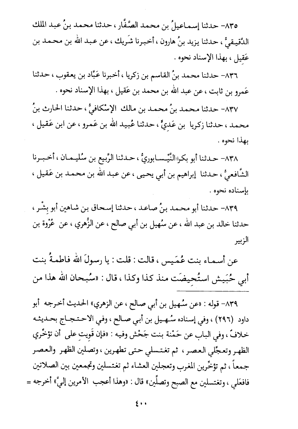 839 - حَدَّثَنَا أَبُو مُحَمَّدِ بْنُ صَاعِدٍ , نا إِسْحَاقُ بْنُ شَاهِينَ أَبُو بِشْرٍ , ثنا خَالِدُ بْنُ عَبْدِ اللَّهِ , عَنْ سُهَيْلِ بْنِ أَبِي صَالِحٍ , عَنِ الزُّهْرِيِّ , عَنْ عُرْوَةَ بْنِ الزُّبَيْرِ , عَنْ أَسْمَاءَ بِنْتِ عُمَيْسٍ , قَالَتْ: قُلْتُ: يَا رَسُولَ اللَّهِ فَاطِمَةُ بِنْتُ أَبِي حُبَيْشٍ اسْتُحِيضَتْ مُنْذُ كَذَا وَكَذَا , قَالَ: «سُبْحَانَ اللَّهِ هَذَا مِنَ -[401]- الشَّيْطَانِ فَلْتَجْلِسْ فِي مَرْكَنٍ» , فَجَلَسَتْ فِيهِ حَتَّى رَأَتِ الصُّفْرَةَ فَوْقَ الْمَاءِ , فَقَالَ: § «تَغْتَسِلُ لِلظُّهْرِ وَالْعَصْرِ غُسْلًا وَاحِدًا , ثُمَّ تَغْتَسِلُ لِلْمَغْرِبِ وَالْعِشَاءِ غُسْلًا وَاحِدًا , ثُمَّ تَغْتَسِلُ لِلْفَجْرِ غُسْلًا وَاحِدًا , ثُمَّ تَتَوَضَّأُ بَيْنَ ذَلِكَ».