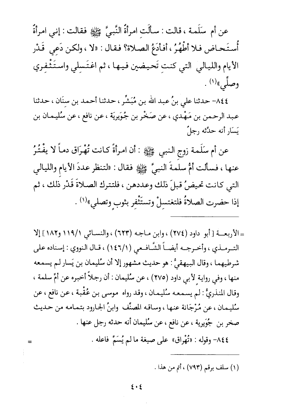 844 - حَدَّثَنَا عَلِيُّ بْنُ عَبْدِ اللَّهِ بْنِ مُبَشِّرٍ , نا أَحْمَدُ بْنُ سِنَانٍ , نا عَبْدُ الرَّحْمَنِ بْنُ مَهْدِيٍّ , عَنْ صَخْرِ بْنِ جُوَيْرِيَةَ , عَنْ نَافِعٍ , عَنْ سُلَيْمَانَ بْنِ يَسَارٍ , أَنَّهُ حَدَّثَهُ رَجُلٌ , عَنْ أُمِّ سَلَمَةَ زَوْجِ النَّبِيِّ صَلَّى اللهُ عَلَيْهِ وَسَلَّمَ , أَنَّ امْرَأَةً كَانَتْ تُهَرَاقُ دَمًا لَا يَفْتُرُ عَنْهَا , فَسَأَلَتْ أُمُّ سَلَمَةَ النَّبِيَّ صَلَّى اللهُ عَلَيْهِ وَسَلَّمَ , فَقَالَ: § «لِتَنْظُرْ عَدَدَ الْأَيَّامِ وَاللَّيَالِي الَّتِي كَانَتْ تَحِيضُ قَبْلَ ذَلِكَ وَعَدَّدَهُنَّ فَلْتَتْرُكِ الصَّلَاةَ قَدْرَ ذَلِكَ ثُمَّ إِذَا حَضَرَتِ الصَّلَاةُ فَلْتَغْتَسِلْ وَتَسْتَثْفِرْ بِثَوْبٍ وَتُصَلِّي»