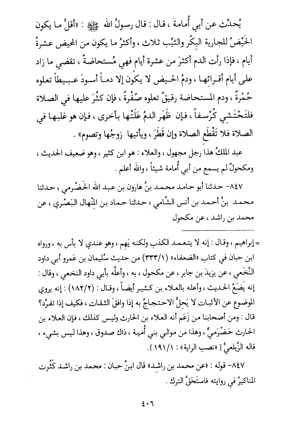 847 - حَدَّثَنَا أَبُو حَامِدٍ مُحَمَّدُ بْنُ هَارُونَ , نا مُحَمَّدُ بْنُ أَحْمَدَ بْنِ أَنَسٍ الشَّامِيُّ , ثنا حَمَّادُ بْنُ الْمِنْهَالِ الْبَصْرِيُّ , عَنْ مُحَمَّدِ بْنِ رَاشِدٍ , عَنْ مَكْحُولٍ , -[407]- عَنْ وَاثِلَةَ بْنِ الْأَسْقَعِ , قَالَ: قَالَ رَسُولُ اللَّهِ صَلَّى اللهُ عَلَيْهِ وَسَلَّمَ: § «أَقَلُّ الْحَيْضِ ثَلَاثَةُ أَيَّامٍ وَأَكْثَرَهُ عَشَرَةُ أَيَّامٍ». ابْنُ مِنْهَالٍ مَجْهُولٌ وَمُحَمَّدُ بْنُ أَحْمَدَ بْنِ أَنَسٍ ضَعِيفٌ