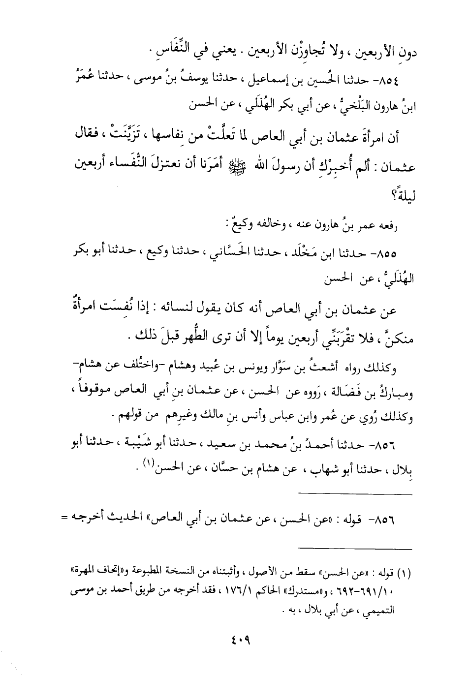 855 - حَدَّثَنَا ابْنُ مَخْلَدٍ , حَدَّثَنَا الْحَسَّانِيُّ , ثنا وَكِيعٌ , ثنا أَبُو بَكْرٍ الْهُذَلِيُّ , عَنِ الْحَسَنِ , عَنْ عُثْمَانَ بْنِ أَبِي الْعَاصِ , أَنَّهُ كَانَ يَقُولُ لِنِسَائِهِ: § «إِذَا نَفِسَتِ امْرَأَةٌ مِنْكُنَّ فَلَا تَقْرَبَنِّي أَرْبَعِينَ يَوْمًا إِلَّا أَنْ تَرَى الطُّهْرَ قَبْلَ ذَلِكَ». وَكَذَلِكَ رَوَاهُ أَشْعَثُ بْنُ سَوَّارٍ , وَيُونُسُ بْنُ عُبَيْدٍ , وَهِشَامٌ , وَاخْتُلِفَ عَنْ هِشَامٍ , وَمُبَارَكِ بْنِ فَضَالَةَ , رَوَوْهُ عَنِ الْحَسَنِ , عَنْ عُثْمَانَ بْنِ أَبِي الْعَاصِ مَوْقُوفًا. وَكَذَلِكَ رُوِيَ عَنْ عُمَرَ , وَابْنِ عَبَّاسٍ , وَأَنَسِ بْنِ مَالِكٍ , وَغَيْرِهِمْ مِنْ قَوْلِهِمْ