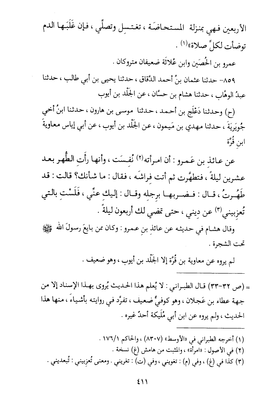 859 - حَدَّثَنَا عُثْمَانُ بْنُ أَحْمَدَ الدَّقَّاقُ , نا يَحْيَى بْنُ أَبِي طَالِبٍ , ثنا عَبْدُ الْوَهَّابِ , ثنا هِشَامُ بْنُ حَسَّانَ , عَنِ الْجَلْدِ بْنِ أَيُّوبَ , ح وَحَدَّثَنَا دَعْلَجُ بْنُ أَحْمَدَ , نا مُوسَى بْنُ هَارُونَ , نا ابْنُ أَخِي جُوَيْرِيَةَ , حَدَّثَنَا مَهْدِيُّ بْنُ مَيْمُونٍ , عَنِ الْجَلْدِ بْنِ أَيُّوبَ , عَنْ أَبِي إِيَاسَ مُعَاوِيَةَ بْنِ قُرَّةَ , عَنْ عَائِذِ بْنِ عَمْرٍو , أَنَّ امْرَأَتَهَ نَفِسَتْ وَأَنَّهَا رَأَتِ الطُّهْرَ بَعْدَ عِشْرِينَ لَيْلَةً فَتَطَهَّرْتُ ثُمَّ أَتَتْ فِرَاشَهُ , فَقَالَ: «مَا شَأْنُكِ؟» , قَالَتْ: قَدْ طَهُرْتُ , قَالَ: فَضَرَبَهَا بِرِجْلِهِ وَقَالَ: «إِلَيْكِ عَنِّي §فَلَسْتِ بِالَّذِي تُعْزِبُنِي عَنْ دِينِي حَتَّى تَمْضِيَ لَكِ أَرْبَعِينَ لَيْلَةً». وَقَالَ هِشَامٌ فِي حَدِيثِهِ , عَنْ عَائِذِ بْنِ عَمْرٍو: وَكَانَ مِمَّنْ بَايَعَ رَسُولَ اللَّهِ صَلَّى اللهُ عَلَيْهِ وَسَلَّمَ تَحْتَ الشَّجَرَةِ , وَلَمْ يَرْوِهِ عَنْ مُعَاوِيَةَ بْنِ قُرَّةَ غَيْرُ الْجَلْدِ بْنِ أَيُّوبَ وَهُوَ ضَعِيفٌ