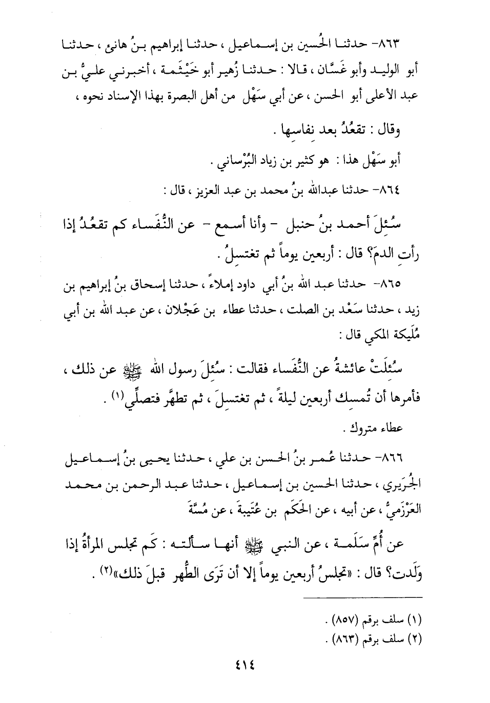 864 - ثنا عَبْدُ اللَّهِ بْنُ مُحَمَّدِ بْنِ عَبْدِ الْعَزِيزِ , قَالَ: سُئِلَ أَحْمَدُ بْنُ حَنْبَلٍ , وَأَنَا أَسْمَعُ عَنِ النُّفَسَاءِ , §كَمْ تَقْعُدُ إِذَا رَأَتِ الدَّمَ؟ , قَالَ: «أَرْبَعِينَ يَوْمًا ثُمَّ تَغْتَسِلُ»