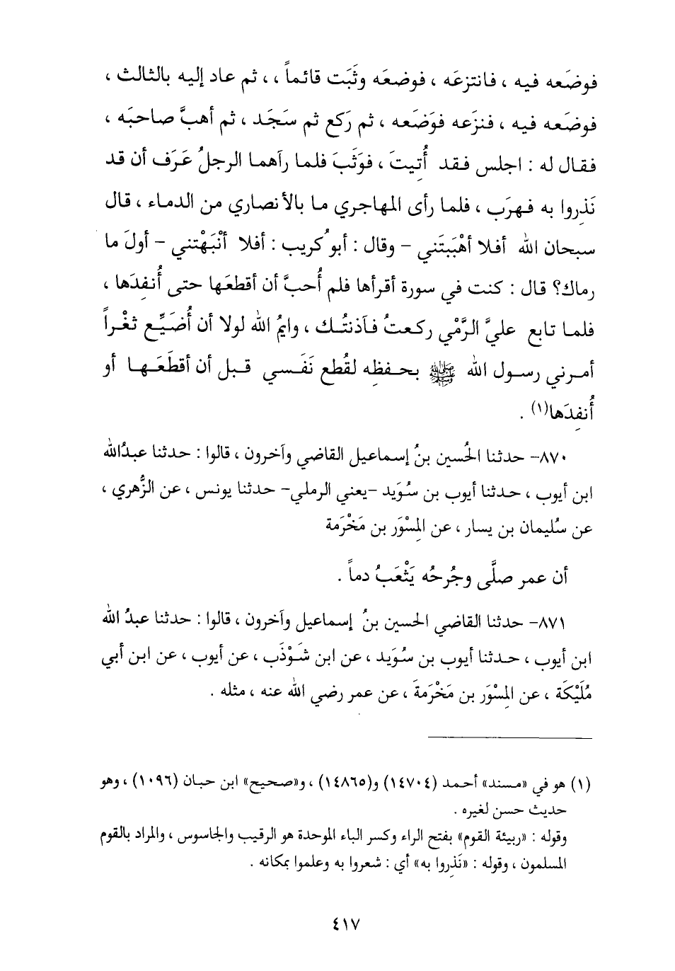 870 - حَدَّثَنَا الْحُسَيْنُ بْنُ إِسْمَاعِيلَ الْقَاضِي , وَآخَرُونَ , قَالُوا: حَدَّثَنَا عَبْدُ اللَّهِ بْنُ أَيُّوبَ , ثنا أَيُّوبُ بْنُ سُوَيْدٍ , نا يُونُسُ , عَنِ الزُّهْرِيِّ , عَنْ سُلَيْمَانَ بْنِ يَسَارٍ , عَنِ الْمِسْوَرِ بْنِ مَخْرَمَةَ , أَنَّ عُمَرَ رَضِيَ اللَّهُ عَنْهُ § «صَلَّى وَجَرْحُهُ يَثْعَبُ دَمًا».