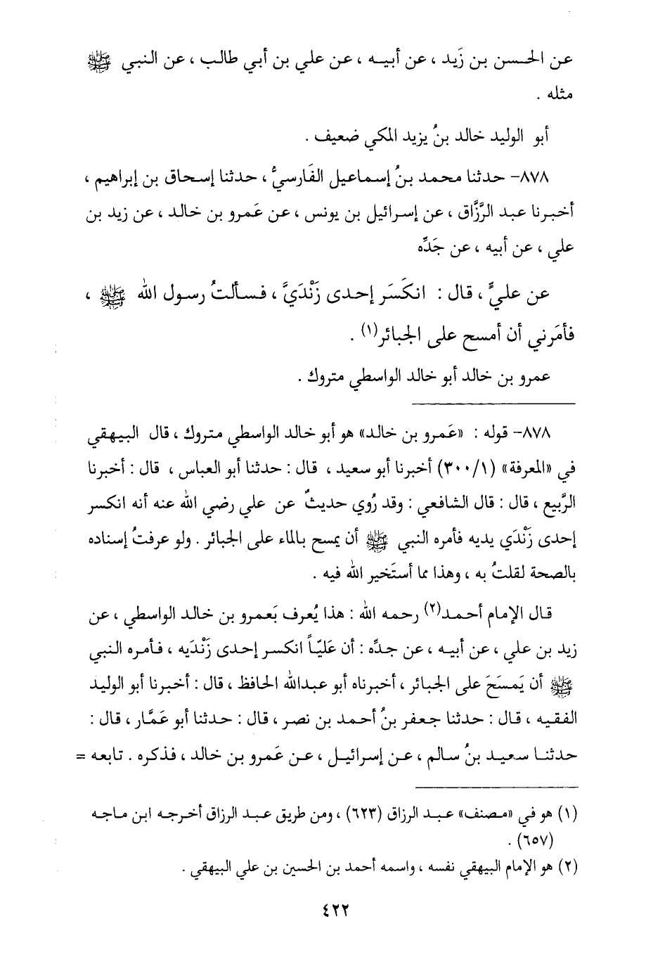 878 - حَدَّثَنَا مُحَمَّدُ بْنُ إِسْمَاعِيلَ الْفَارِسِيُّ , ثنا إِسْحَاقُ بْنُ إِبْرَاهِيمَ , أنا عَبْدُ الرَّزَّاقِ , عَنْ إِسْرَائِيلَ بْنِ يُونُسَ , عَنْ عَمْرِو بْنِ خَالِدٍ , عَنْ زَيْدِ بْنِ عَلِيٍّ , عَنْ أَبِيهِ , عَنْ جَدِّهِ , عَنْ عَلِيِّ بْنِ أَبِي طَالِبٍ رَضِيَ اللَّهُ عَنْهُ , قَالَ: انْكَسَرَ إِحْدَى زَنْدَيَّ فَسَأَلْتُ رَسُولَ اللَّهِ صَلَّى اللهُ عَلَيْهِ وَسَلَّمَ فَأَمَرَنِي «أَنْ §أَمْسَحَ عَلَى الْجَبَائِرِ». عَمْرُو بْنُ خَالِدٍ الْوَاسِطِيُّ مَتْرُوكٌ
