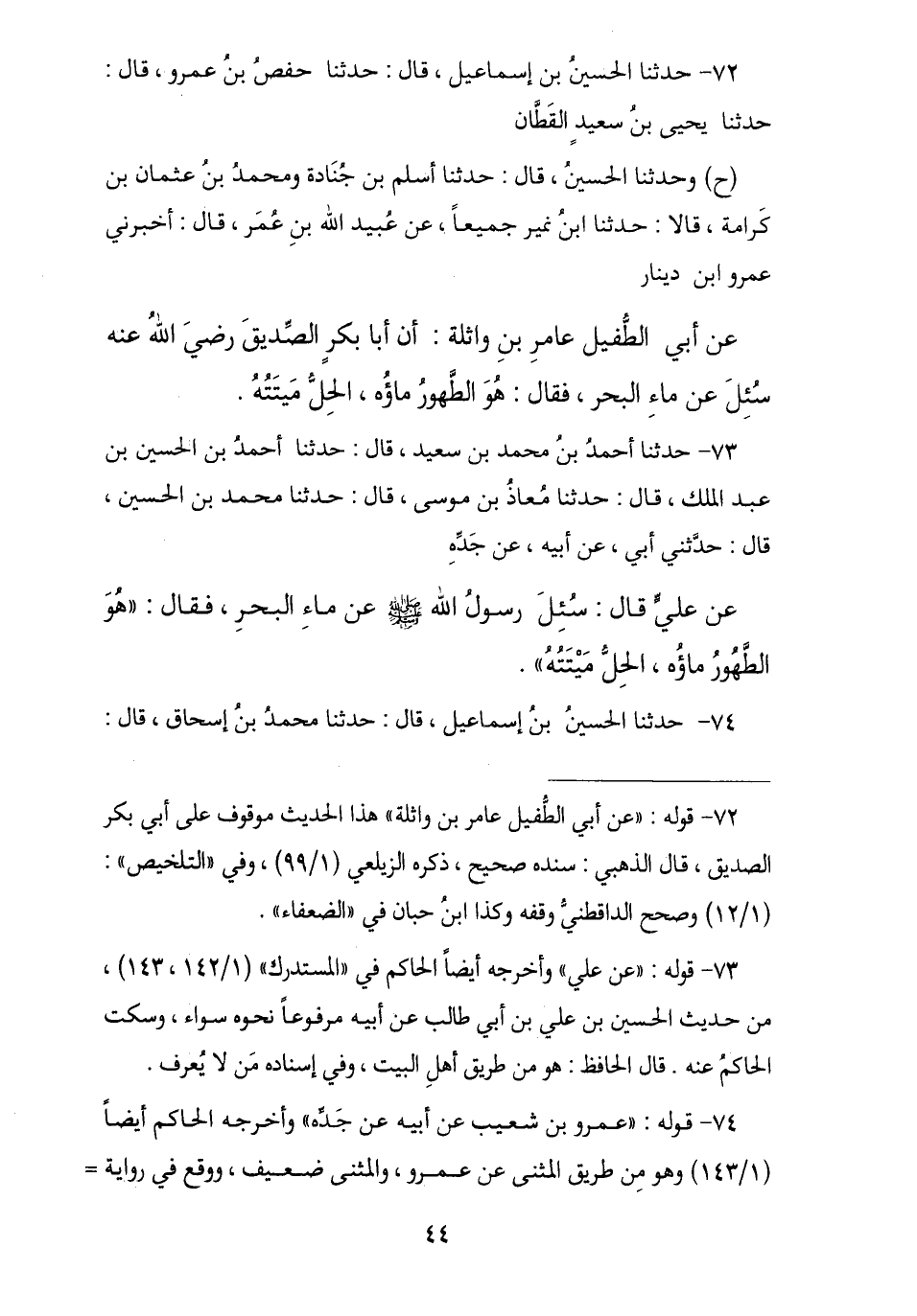 72 - حَدَّثَنَا الْحُسَيْنُ بْنُ إِسْمَاعِيلَ , نا حَفْصُ بْنُ عَمْرٍو , نا يَحْيَى بْنُ سَعِيدٍ الْقَطَّانُ , ح وَنا الْحُسَيْنُ , نا سَلْمُ بْنُ جُنَادَةَ , وَمُحَمَّدُ بْنُ عُثْمَانَ بْنِ كَرَامَةَ , قَالَا: نا ابْنُ نُمَيْرٍ جَمِيعًا , عَنْ عُبَيْدِ اللَّهِ بْنِ عُمَرَ , أَخْبَرَنِي عَمْرُو بْنُ دِينَارٍ , عَنْ أَبِي الطُّفَيْلِ عَامِرِ بْنِ وَاثِلَةَ , أَنَّ أَبَا بَكْرٍ الصِّدِّيقَ رَضِيَ اللَّهُ عَنْهُ سُئِلَ عَنْ مَاءِ الْبَحْرِ , فَقَالَ: § «هُوَ الطَّهُورُ مَاؤُهُ الْحِلُّ مَيْتَتُهُ»