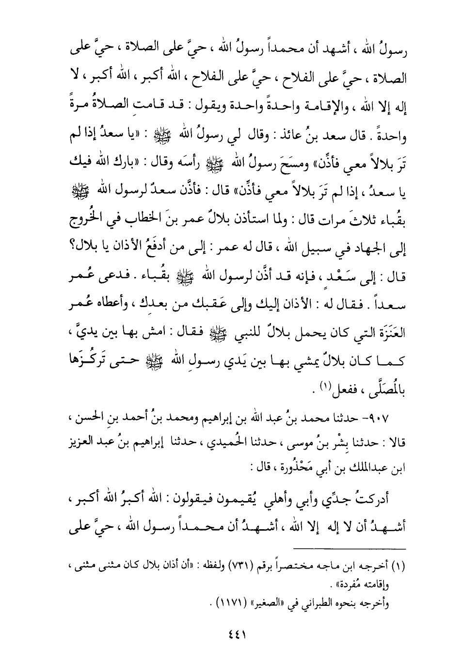 907 - حَدَّثَنَا مُحَمَّدُ بْنُ عَبْدِ اللَّهِ بْنِ إِبْرَاهِيمَ , وَمُحَمَّدُ بْنُ أَحْمَدَ بْنِ الْحَسَنِ , قَالَا: نا بِشْرُ بْنُ مُوسَى , ثنا الْحُمَيْدِيُّ , نا إِبْرَاهِيمُ بْنُ عَبْدِ الْعَزِيزِ بْنِ عَبْدِ الْمَلِكِ بْنِ أَبِي مَحْذُورَةَ , قَالَ: " أَدْرَكْتُ جَدِّي وَأَبِي وَأَهْلِي يُقِيمُونَ فَيَقُولُونَ: §اللَّهُ أَكْبَرُ اللَّهُ أَكْبَرُ , أَشْهَدُ أَنْ لَا إِلَهَ إِلَّا اللَّهُ , أَشْهَدُ أَنَّ مُحَمَّدًا رَسُولُ اللَّهِ , حَيَّ عَلَى -[442]- الصَّلَاةِ حَيَّ عَلَى الْفَلَاحِ , قَدْ قَامَتِ الصَّلَاةُ قَدْ قَامَتِ الصَّلَاةُ , اللَّهُ أَكْبَرُ اللَّهُ أَكْبَرُ , لَا إِلَهَ إِلَّا اللَّهُ "