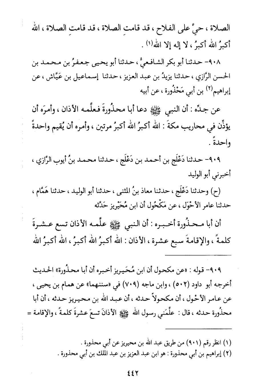 909 - حَدَّثَنَا أَبُو مُحَمَّدٍ دَعْلَجُ بْنُ أَحْمَدَ بْنِ دَعْلَجٍ , ثنا مُحَمَّدُ بْنُ أَيُّوبَ الرَّازِيُّ , أَخْبَرَنِي أَبُو الْوَلِيدِ , ح وَحَدَّثَنَا دَعْلَجٌ , أنا مُعَاذُ بْنُ الْمُثَنَّى , ثنا أَبُو الْوَلِيدِ , ثنا هَمَّامٌ , ثنا عَامِرٌ الْأَحْوَلُ , عَنْ مَكْحُولٍ , أَنَّ ابْنَ مُحَيْرِيزٍ أَخْبَرَهُ , أَنَّ أَبَا مَحْذُورَةَ أَخْبَرَهُ , أَنَّ النَّبِيَّ صَلَّى اللهُ عَلَيْهِ وَسَلَّمَ عَلَّمَهُ الْأَذَانَ تِسْعَ عَشْرَةَ كَلِمَةً , وَالْإِقَامَةَ سَبْعَ عَشْرَةَ كَلِمَةً , الْأَذَانُ: § «اللَّهُ أَكْبَرُ اللَّهُ أَكْبَرُ اللَّهُ أَكْبَرُ اللَّهُ -[443]- أَكْبَرُ , أَشْهَدُ أَنْ لَا إِلَهَ إِلَّا اللَّهُ , أَشْهَدُ أَنْ لَا إِلَهَ إِلَّا اللَّهُ , أَشْهَدُ أَنَّ مُحَمَّدًا رَسُولُ اللَّهِ , أَشْهَدُ أَنَّ مُحَمَّدًا رَسُولُ اللَّهِ , أَشْهَدُ أَنْ لَا إِلَهَ إِلَّا اللَّهُ , أَشْهَدُ أَنْ لَا إِلَهَ إِلَّا اللَّهُ , أَشْهَدُ أَنَّ مُحَمَّدًا رَسُولُ اللَّهِ , أَشْهَدُ أَنَّ مُحَمَّدًا رَسُولُ اللَّهِ , حَيَّ عَلَى الصَّلَاةِ حَيَّ عَلَى الصَّلَاةِ , حَيَّ عَلَى الْفَلَاحِ حَيَّ عَلَى الْفَلَاحِ , اللَّهُ أَكْبَرُ اللَّهُ أَكْبَرُ لَا إِلَهَ إِلَّا اللَّهُ , وَالْإِقَامَةُ هَكَذَا مَثْنَى مَثْنَى لَا يَعُودُ مِنْ ذَلِكَ الْمَوْضِعِ»