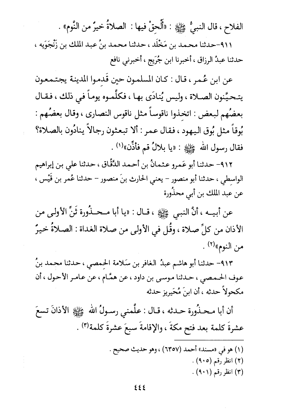 911 - حَدَّثَنَا مُحَمَّدُ بْنُ مَخْلَدٍ , ثنا مُحَمَّدُ بْنُ عَبْدِ الْمَلِكِ بْنِ زَنْجُوَيْهِ , ثنا عَبْدُ الرَّزَّاقِ , أنا ابْنُ جُرَيْجٍ , أَخْبَرَنِي نَافِعٌ , عَنِ ابْنِ عُمَرَ , قَالَ: كَانَ الْمُسْلِمُونَ حِينَ قَدِمُوا الْمَدِينَةَ يَجْتَمِعُونَ يَتَحَيَّنُونَ الصَّلَاةَ وَلَيْسَ يُنَادِي بِهَا وَكَلَّمُوهُ يَوْمًا فِي ذَلِكَ , فَقَالَ بَعْضُهُمْ لِبَعْضٍ: اتَّخِذُوا نَاقُوسًا مِثْلَ نَاقُوسِ النَّصَارَى وَقَالَ بَعْضُهُمْ: بُوقًا مِثْلَ بُوقِ الْيَهُودِ , فَقَالَ عُمَرُ رَضِيَ اللَّهُ عَنْهُ: أَلَا تَبْعَثُوا رِجَالًا يُنَادُونَ بِالصَّلَاةِ؟ , فَقَالَ رَسُولُ اللَّهِ صَلَّى اللهُ عَلَيْهِ وَسَلَّمَ: § «يَا بِلَالُ قُمْ فَأَذِّنْ»