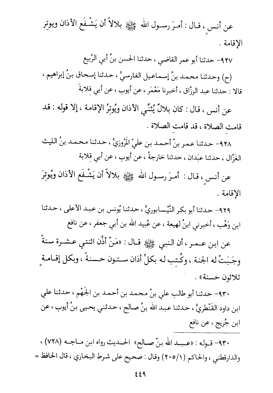 927 - ثنا أَبُو عُمَرَ الْقَاضِي , ثنا الْحَسَنُ بْنُ أَبِي الرَّبِيعِ , ح وَحَدَّثَنَا مُحَمَّدُ بْنُ إِسْمَاعِيلَ الْفَارِسِيُّ , ثنا إِسْحَاقُ بْنُ إِبْرَاهِيمَ , قَالَا: نا عَبْدُ الرَّزَّاقِ , ثنا مَعْمَرٌ , عَنْ أَيُّوبَ , عَنْ أَبِي قِلَابَةَ , عَنْ أَنَسٍ , قَالَ: " كَانَ بِلَالٌ §يُثْنِي الْأَذَانَ , وَيُوتِرُ الْإِقَامَةَ , إِلَّا قَوْلَهُ: قَدْ قَامَتِ الصَّلَاةُ "