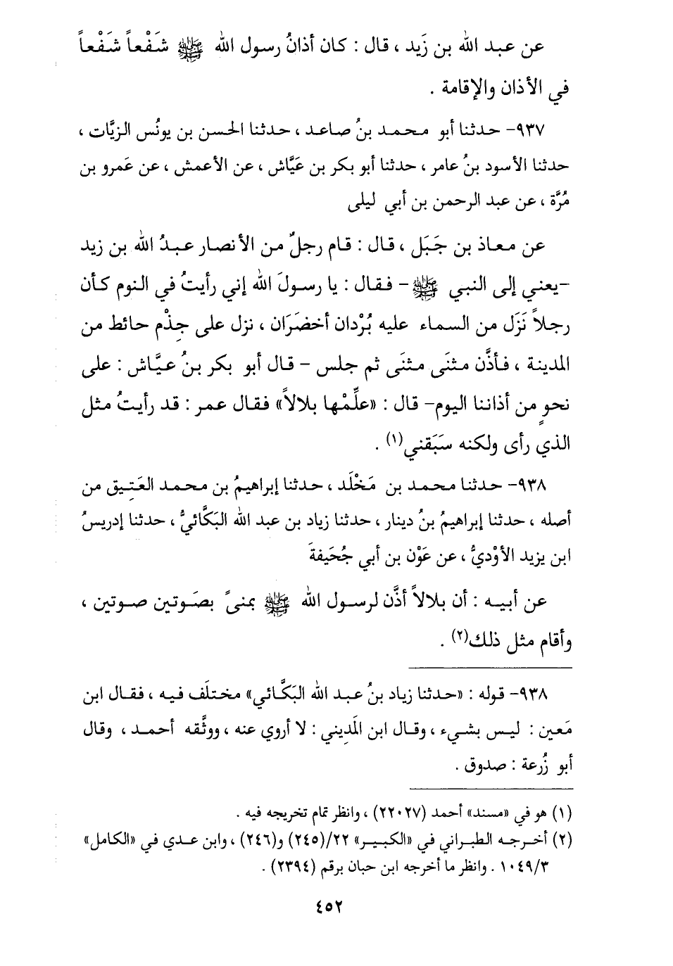 937 - حَدَّثَنَا أَبُو مُحَمَّدِ بْنُ صَاعِدٍ , ثنا الْحَسَنُ بْنُ يُونُسَ , ثنا الْأَسْوَدُ بْنُ عَامِرٍ , ثنا أَبُو بَكْرِ بْنُ عَيَّاشٍ , عَنِ الْأَعْمَشِ , عَنْ عَمْرِو بْنِ مُرَّةَ , عَنْ عَبْدِ الرَّحْمَنِ بْنِ أَبِي لَيْلَى , عَنْ مُعَاذِ بْنِ جَبَلٍ , قَالَ: قَامَ رَجُلٌ مِنَ الْأَنْصَارِ عَبْدُ اللَّهِ بْنُ زَيْدٍ يَعْنِي إِلَى النَّبِيِّ صَلَّى اللهُ عَلَيْهِ وَسَلَّمَ , فَقَالَ: يَا رَسُولَ اللَّهِ إِنِّي رَأَيْتُ فِيَ النَّوْمِ كَأَنَّ رَجُلًا نَزَلَ مِنَ السَّمَاءِ عَلَيْهِ بُرْدَانِ أَخْضَرَانِ نَزَلَ عَلَى جِذْمِ حَائِطٍ مِنَ الْمَدِينَةِ , فَأَذَّنَ مَثْنَى مَثْنَى ثُمَّ جَلَسَ ثُمَّ قَامَ فَقَالَ مَثْنَى مَثْنَى - قَالَ أَبُو بَكْرِ بْنُ عَيَّاشٍ عَلَى نَحْوِ مِنْ أَذَانِنَا الْيَوْمَ - قَالَ: «§عَلِّمْهَا بِلَالًا» , فَقَالَ عُمَرُ رَضِيَ اللَّهُ عَنْهُ: قَدْ رَأَيْتُ مِثْلَ الَّذِي رَأَى وَلَكِنَّهُ سَبَقَنِي